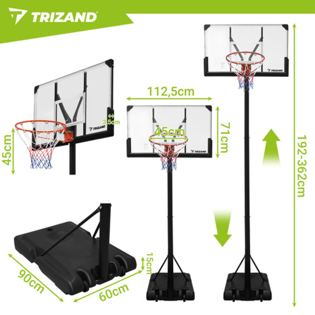 Trizand krepšinio stovas – tai pilnas treniruočių rinkinys, leidžiantis žaisti ir treniruotis beveik kaip tikroje aikštelėje neišeinant iš namų. Reguliuojamas aukštis, tvirta konstrukcija ir lengvas perstatymas leidžia pritaikyti stovą skirtingo amžiaus naudotojams ir įvairioms vietoms. Šis modelis tinka vaikams, paaugliams ir suaugusiesiems.