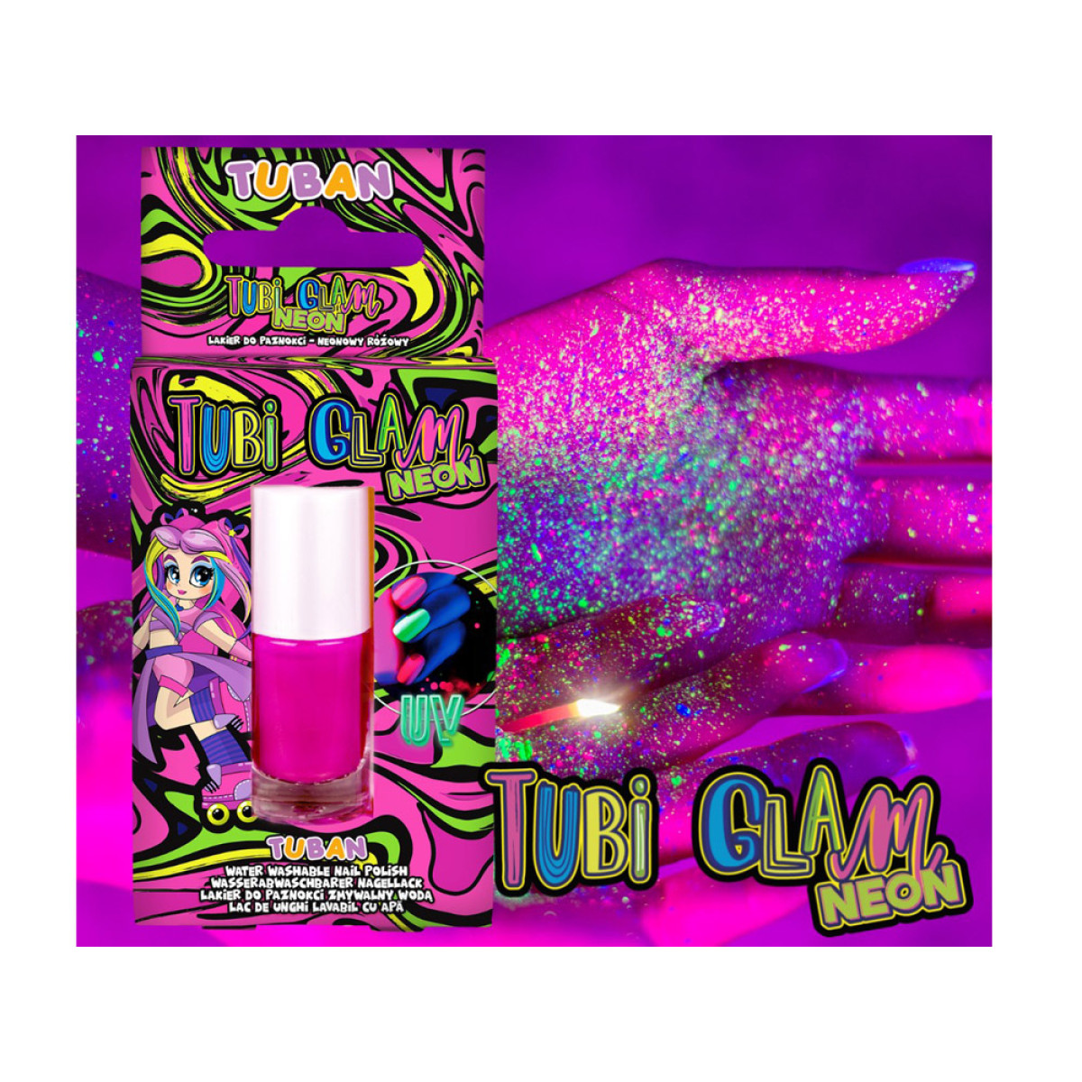 Neoninis Tubi Glam nagų lako atspalvis ne tik pasižymi intensyvia rožine spalva, bet ir užtikrina saugų naudojimą. Jis pagamintas taip, kad būtų visiškai saugus vaiko nagų plokštelei. Norint nuvalyti laką, pakanka šilto vandens ir kempinėlės, todėl mažoji mados mėgėja galės keisti nagų spalvą net kelis kartus per dieną.