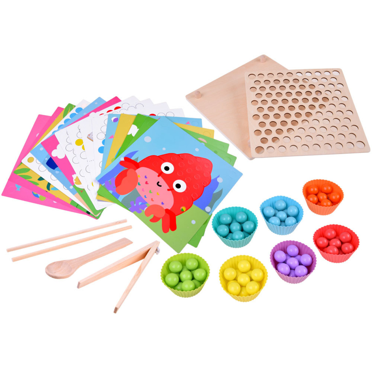 Vaiko užduotis yra sudėlioti/pavaizduoti paveikslėlį naudojant spalvotus karoliukus, dėliojant juos žnyplėmis, lazdelėmis arba šaukštu.