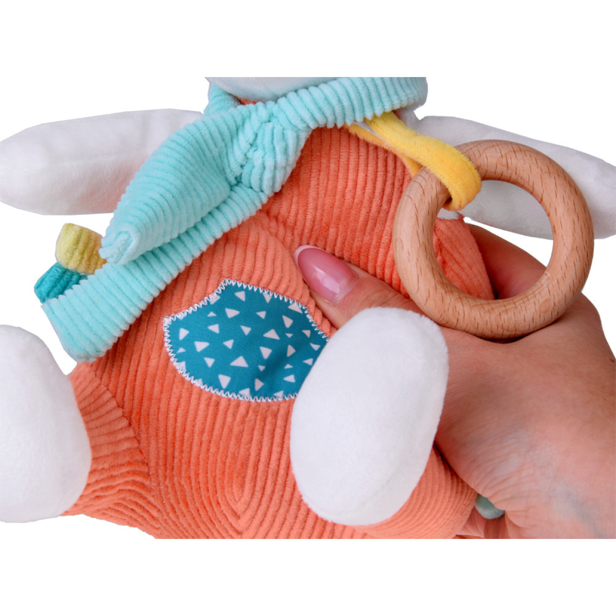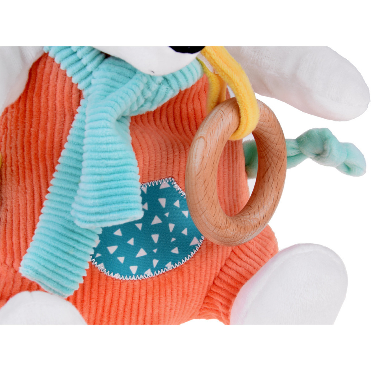 Lapiukas turi medinį žiedelį, kuris ne tik atrodo estetiškai, bet ir yra malonus liesti bei saugus kūdikiui. Viduje įdėtas švelnus varpelis, skleidžiantis ramius garsus kiekvieno judesio metu, stimuliuojantis vaiko pojūčius ir pritraukiantis jo dėmesį.