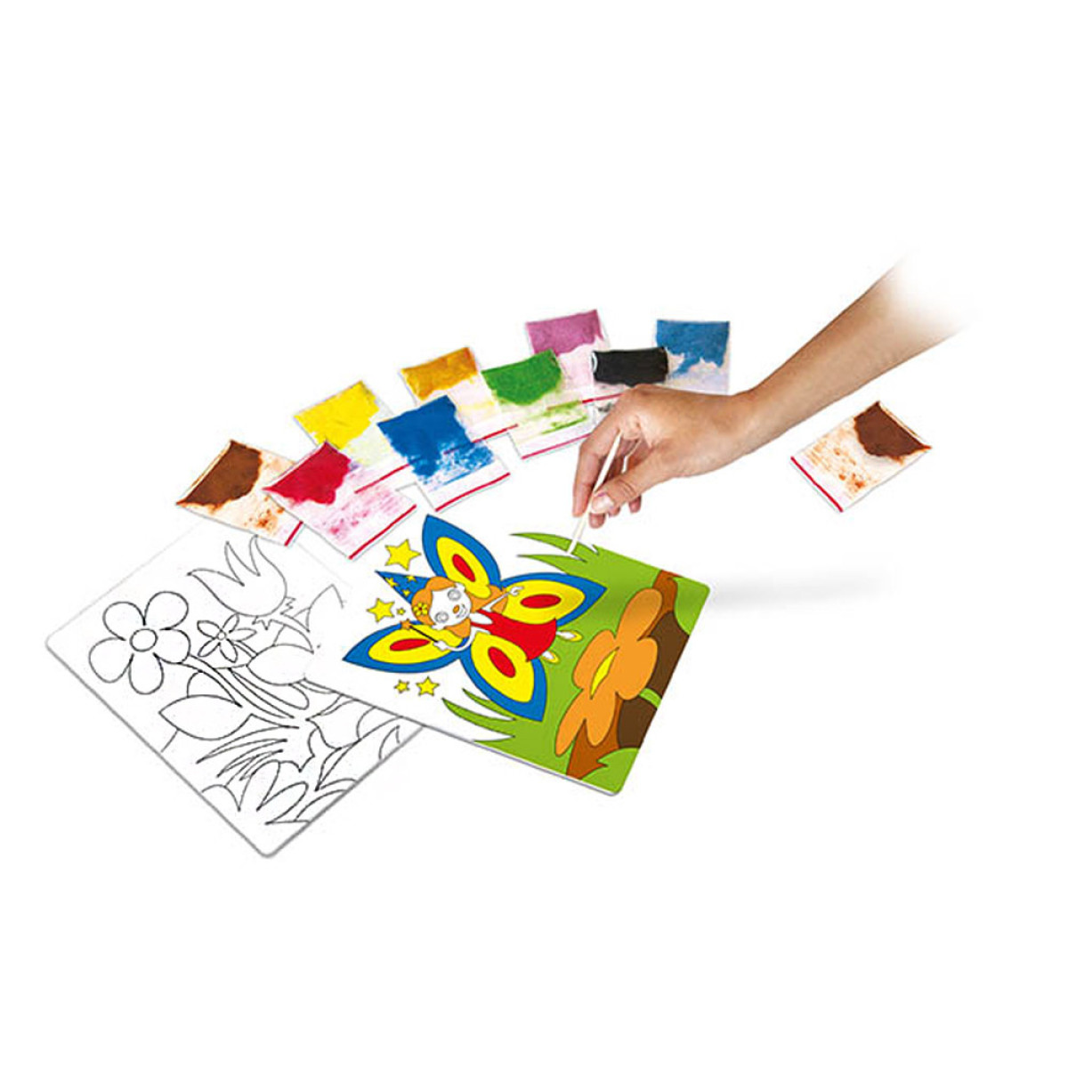 Pasirinkę paveikslėlį, padėkite jį ant popierinės pagrindo. Naudodami medinę lazdelę, atskirkite paveikslėlio dalis, kurios jau padengtos klijais. Pasirinktas sritis apibarstykite spalvotu smėliu – galite sekti instrukcijų pavyzdžiu arba kurti pagal savo idėją. Švelniai prispauskite smėlį, kad gerai priliptų, o po akimirkos perteklių nukratykite ant pagrindo. Viskas! Galite pereiti prie kito elemento, o smėlio perteklių supilti atgal į maišelį – jis dar pravers.