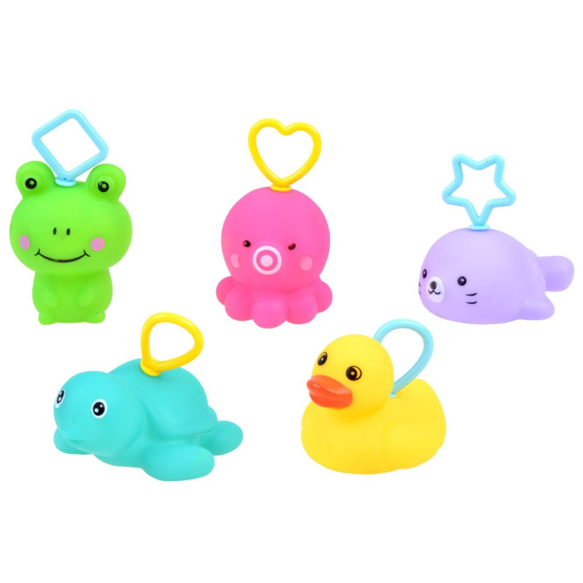 Guminiai gyvūnėliai puikiai tinka maudynėms, žaislai turi plastikinius kabliukus, kad vaikai galėtų juos žvejoti žaidimo metu. Be to, kiekvienas gyvūnėlis turi įmontuotą švilpuką.