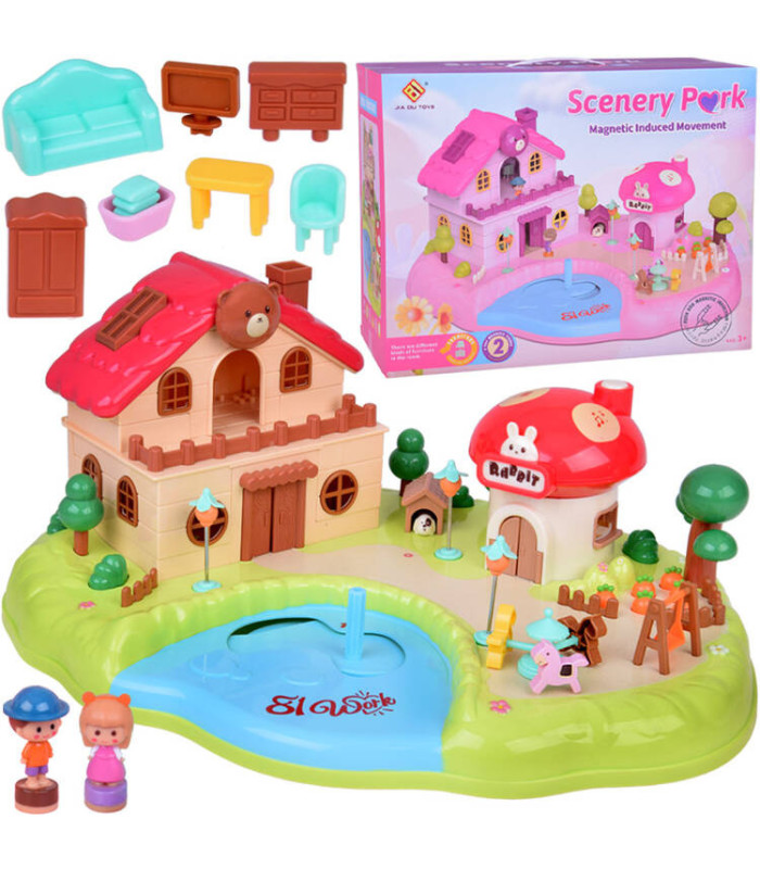 Magnetinis Namelis su Judančiomis Dalimis - "Scenery Park" yra edukacinis žaislas, pagrįstas magnetinės indukcijos sukurtu judesiu. Rinkinys vaizduoja spalvingą sceną su jaukiu, atidaromu nameliu, grybo formos parduotuvėle ir žaidimų aikštele, apsupta medžiais, morkų lysve ir kitais mielais elementais. Žaislas aprūpintas garsiniais ir šviesos efektais, kurie paįvairins žaidimą.