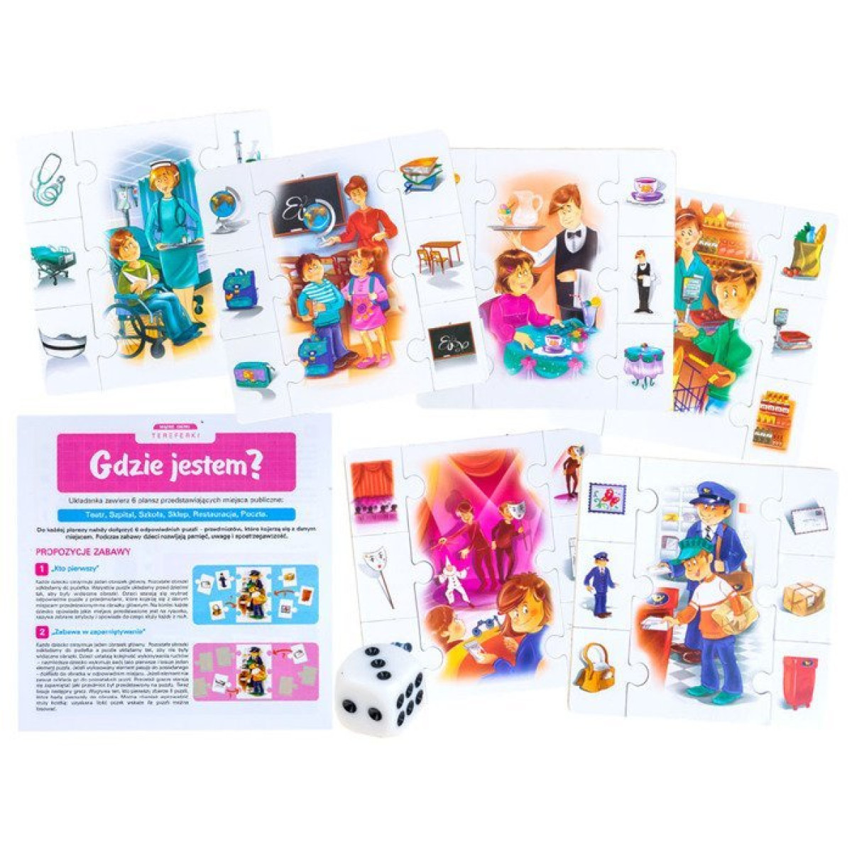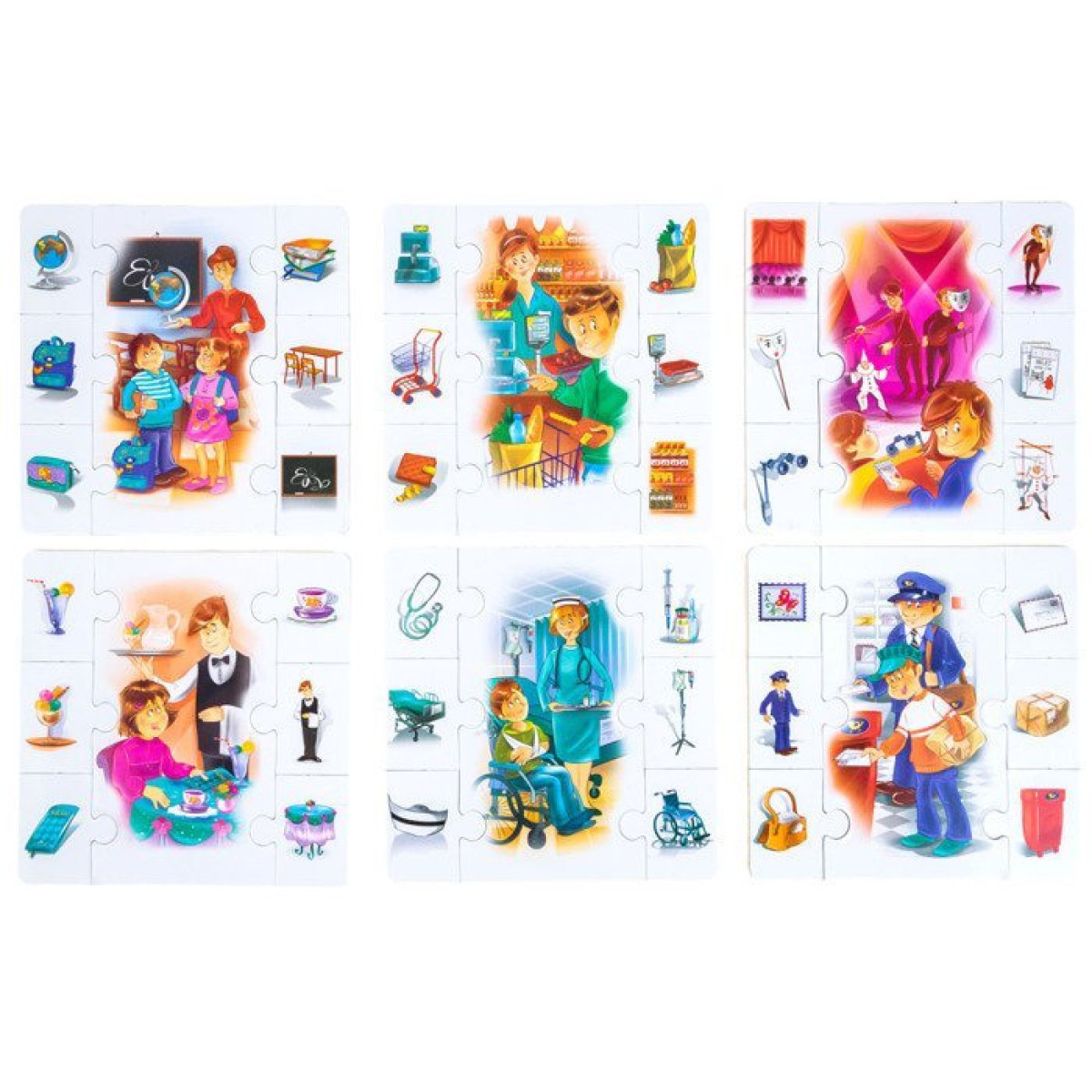 - 36 dėlionės dalys su rekvizitais, kurie atitinka aprašytas vietas. Kiekvienas daiktas dėlionės dalyse susijęs su būdingais elementais, esančiais toje vietoje, pavyzdžiui, laiškai ir siuntos pašte, knygos mokykloje, bilietai teatre ar maistas restorane.