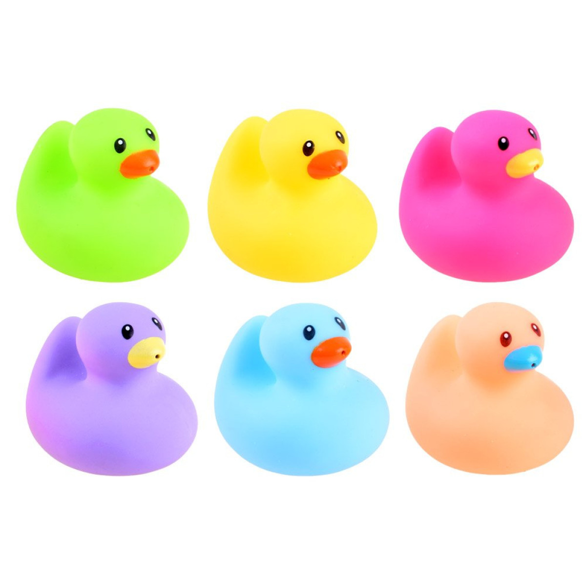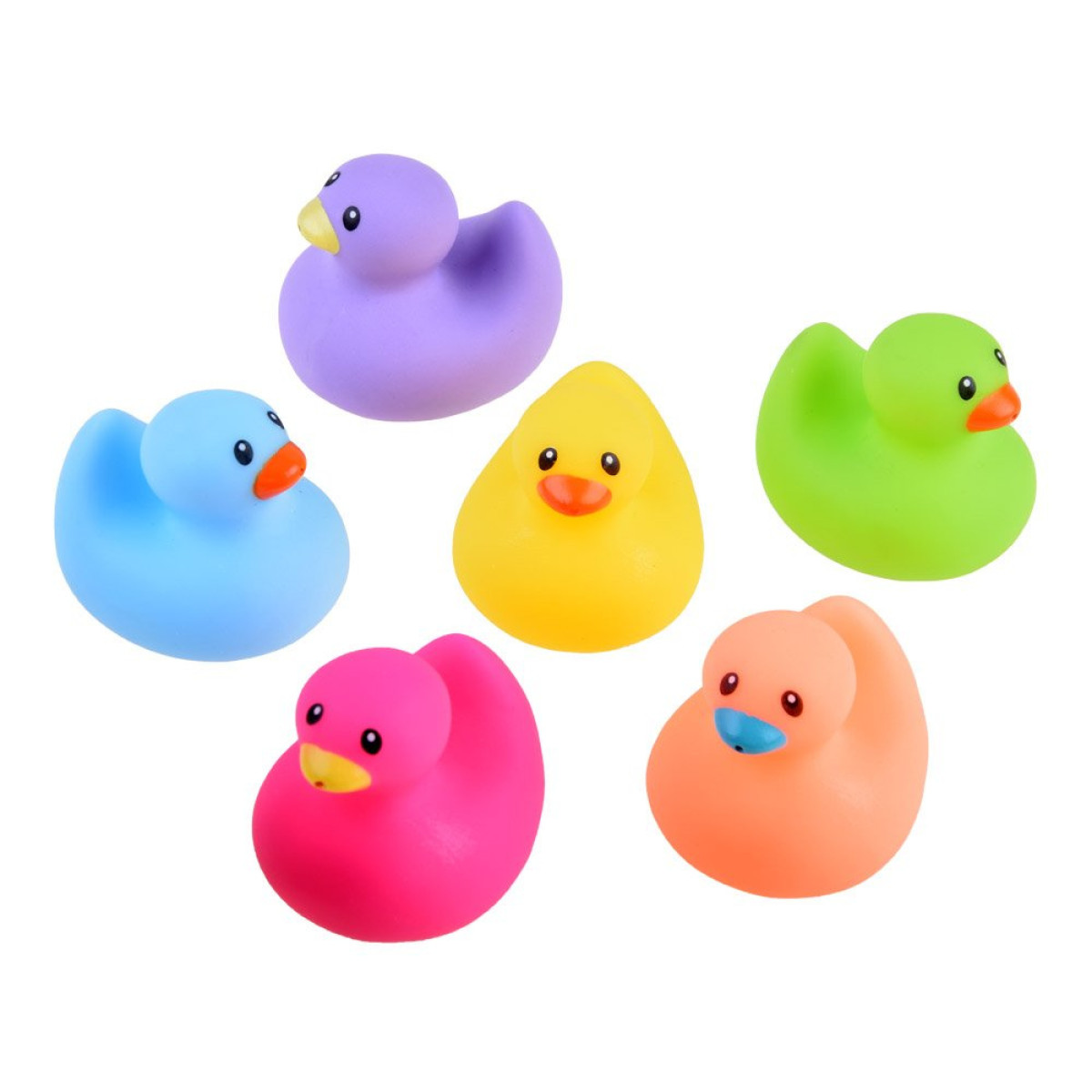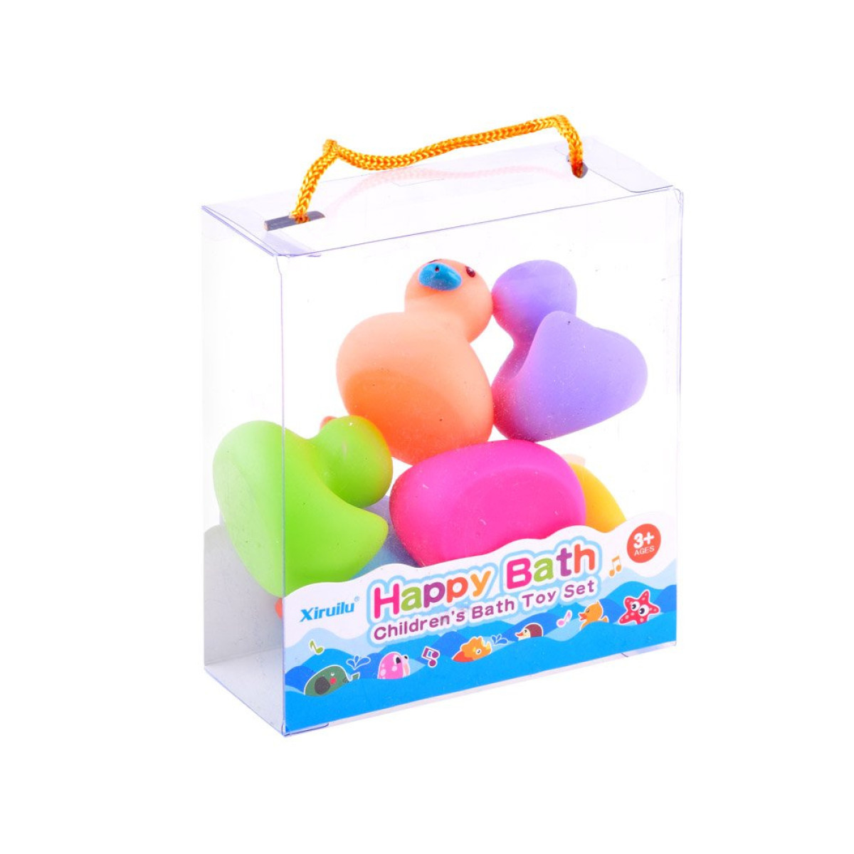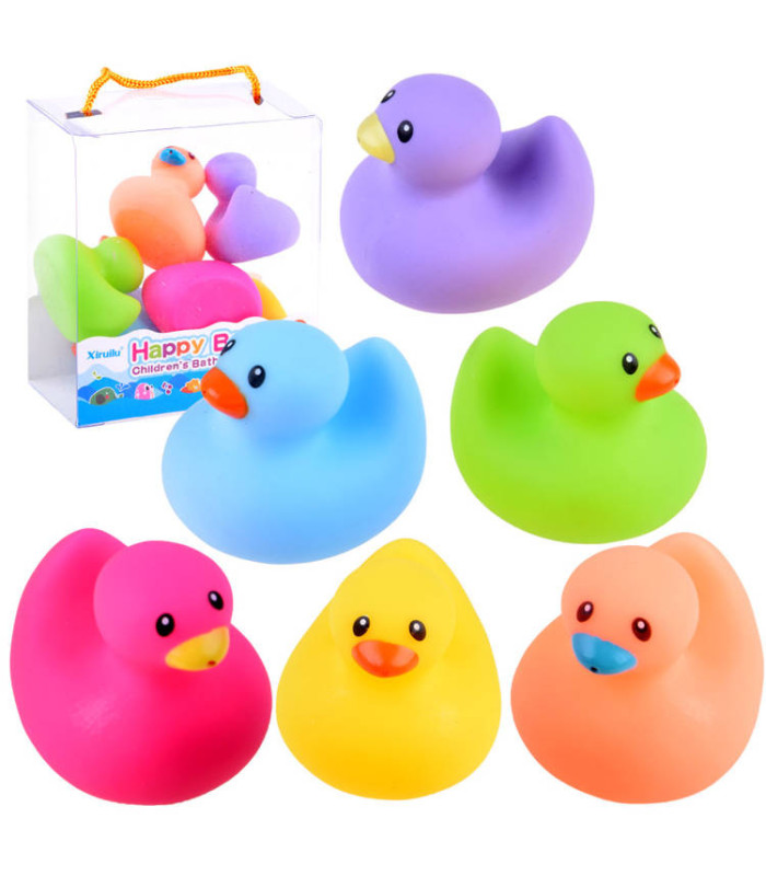 Šešios gumos ančiukai, įvairių spalvų, suteiks daug džiaugsmo maudymosi metu. Privalumai: ančiukai yra minkšti ir spalvoti, jų snapeliai turi skylutes, tad galima juos naudoti vandeniui purkšti. Tai puikus būdas mokytis ir įtvirtinti spalvas. Vaikai gali kurti įvairias istorijas apie ančiukus ar dainuoti dainas.