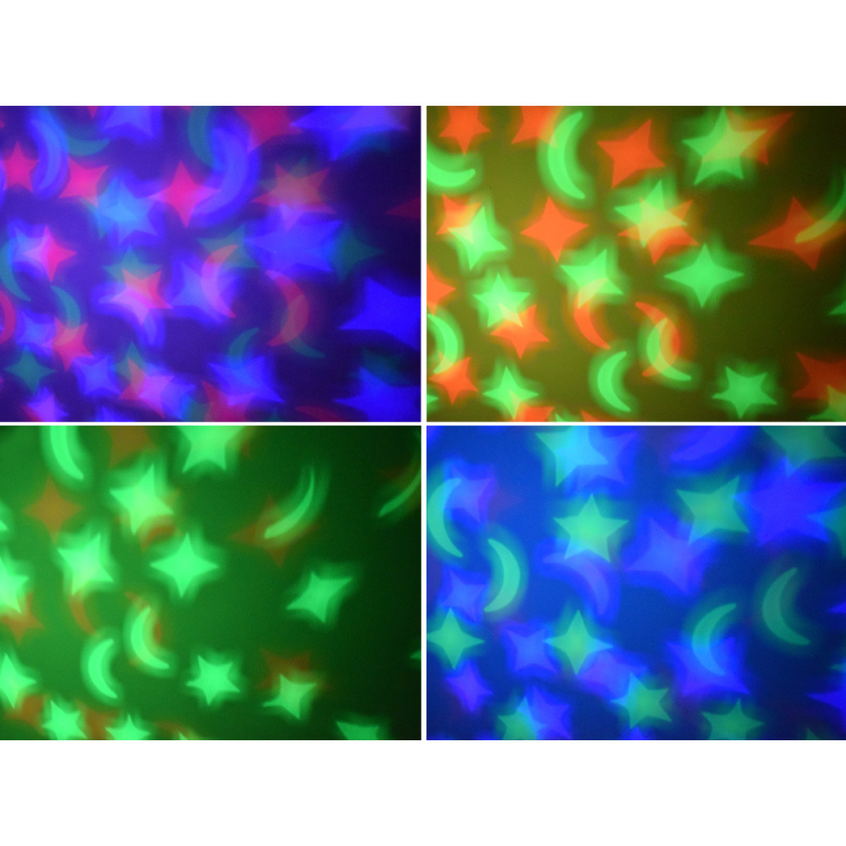 - Projektuoja ant lubų ir sienų spalvotas žvaigždutes ir mėnulius raudonos, žalios ir mėlynos spalvų atspalviais, sukuriant magišką atmosferą