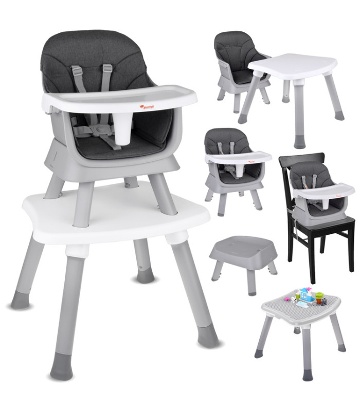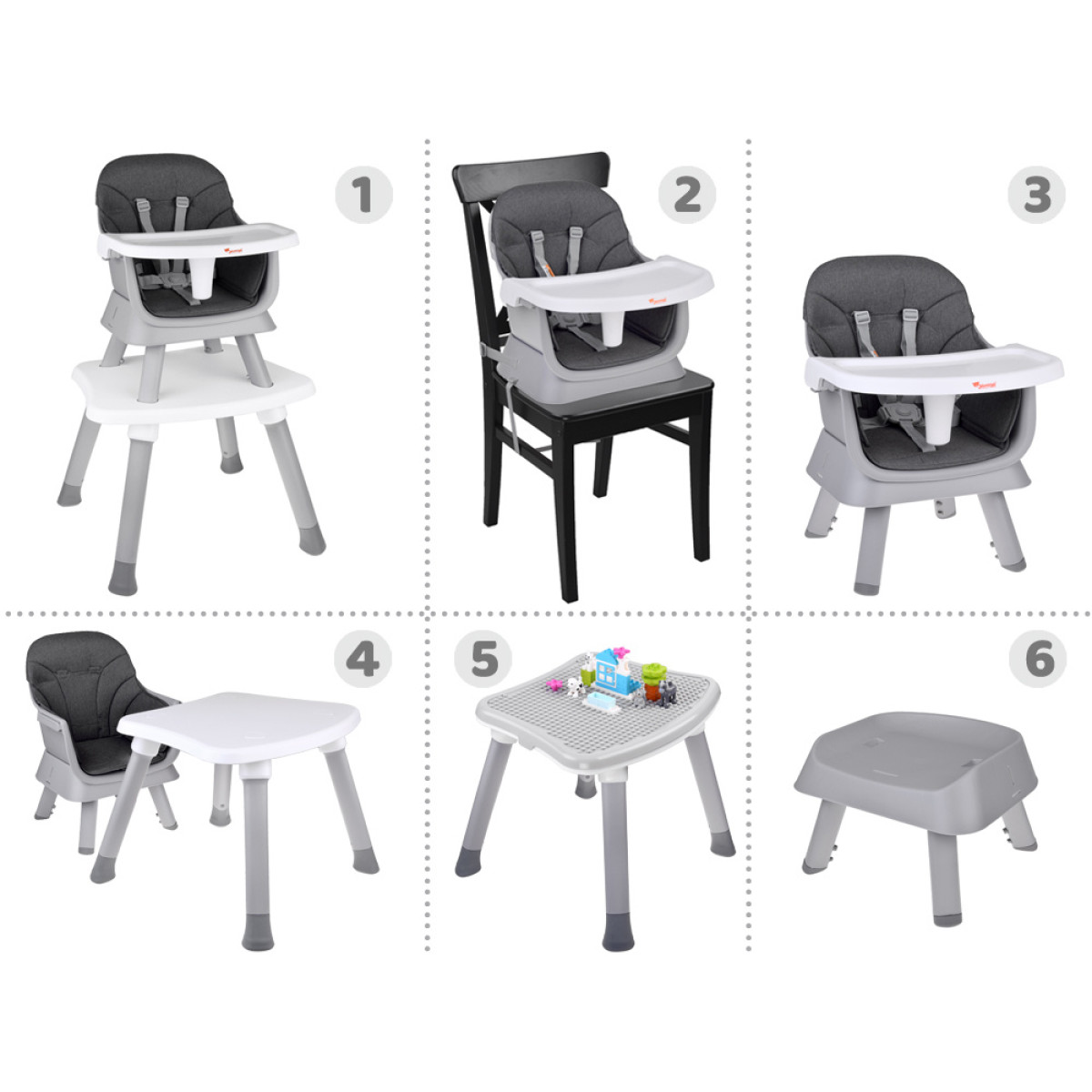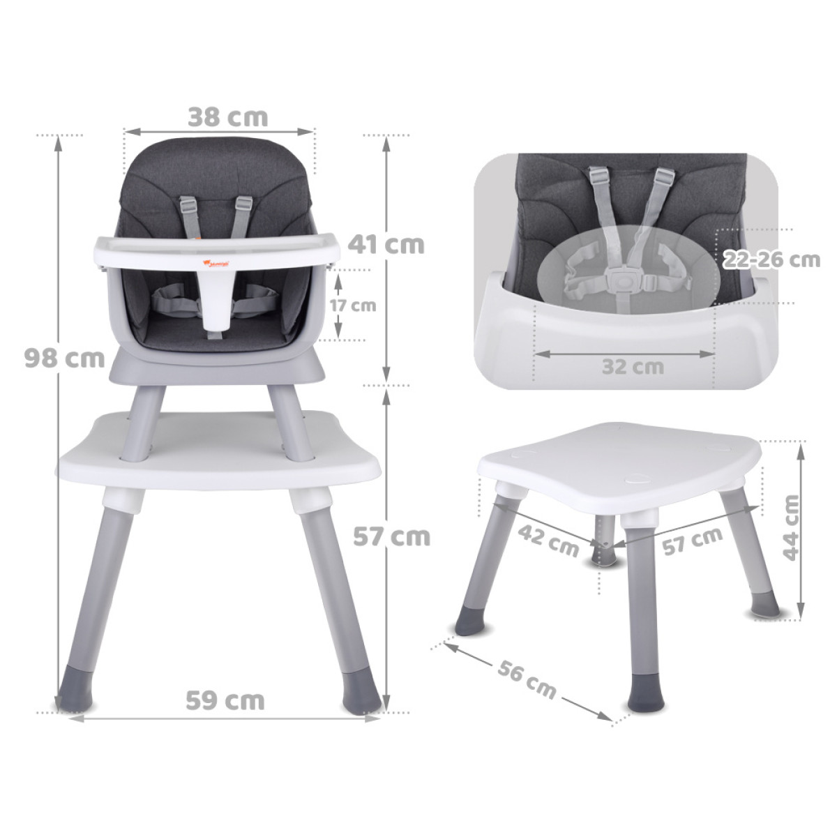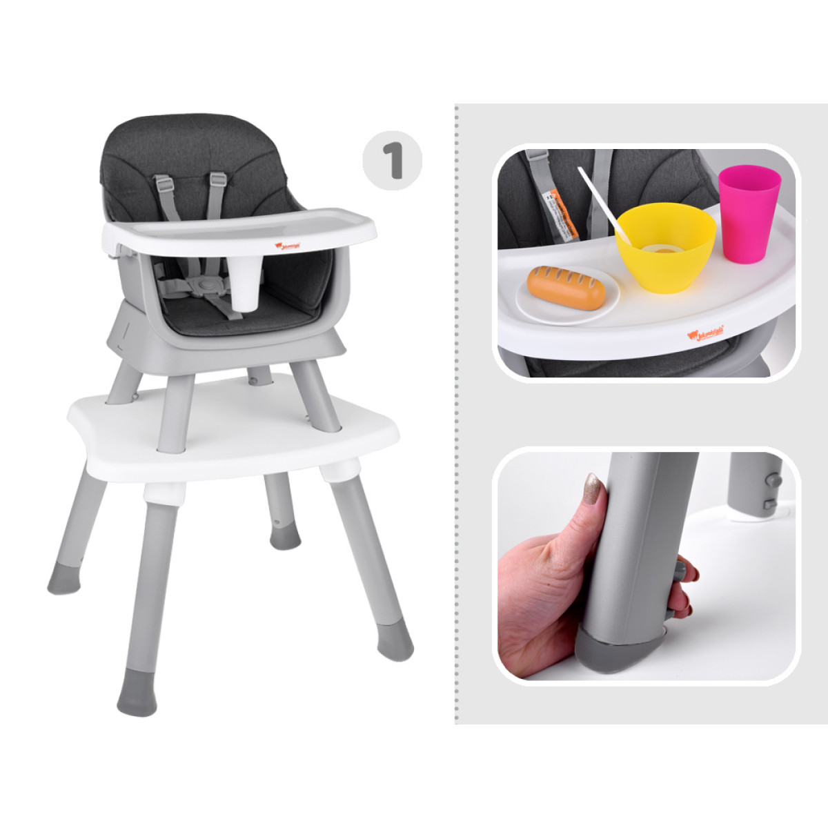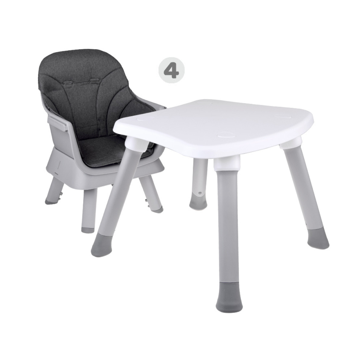 Rinkinys 6in1 yra „viskas viename“ sprendimas, taupantis vietą, pinigus ir laiką. Vienas baldas pakeičia kelis kitus, o jo intuityvus naudojimas palengvina kasdienį maitinimą ir žaidimus.