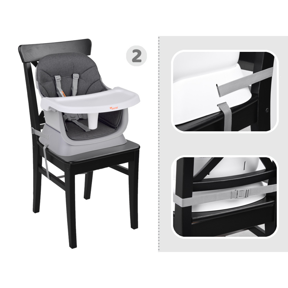 - Valgomojo kėdės priedas – saugiai pritvirtinkite kėdutę prie standartinės kėdės, kad vaikas galėtų sėdėti prie stalo kartu su šeima, mokydamasis bendro valgymo taisyklių.