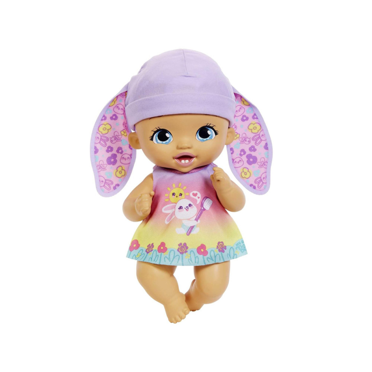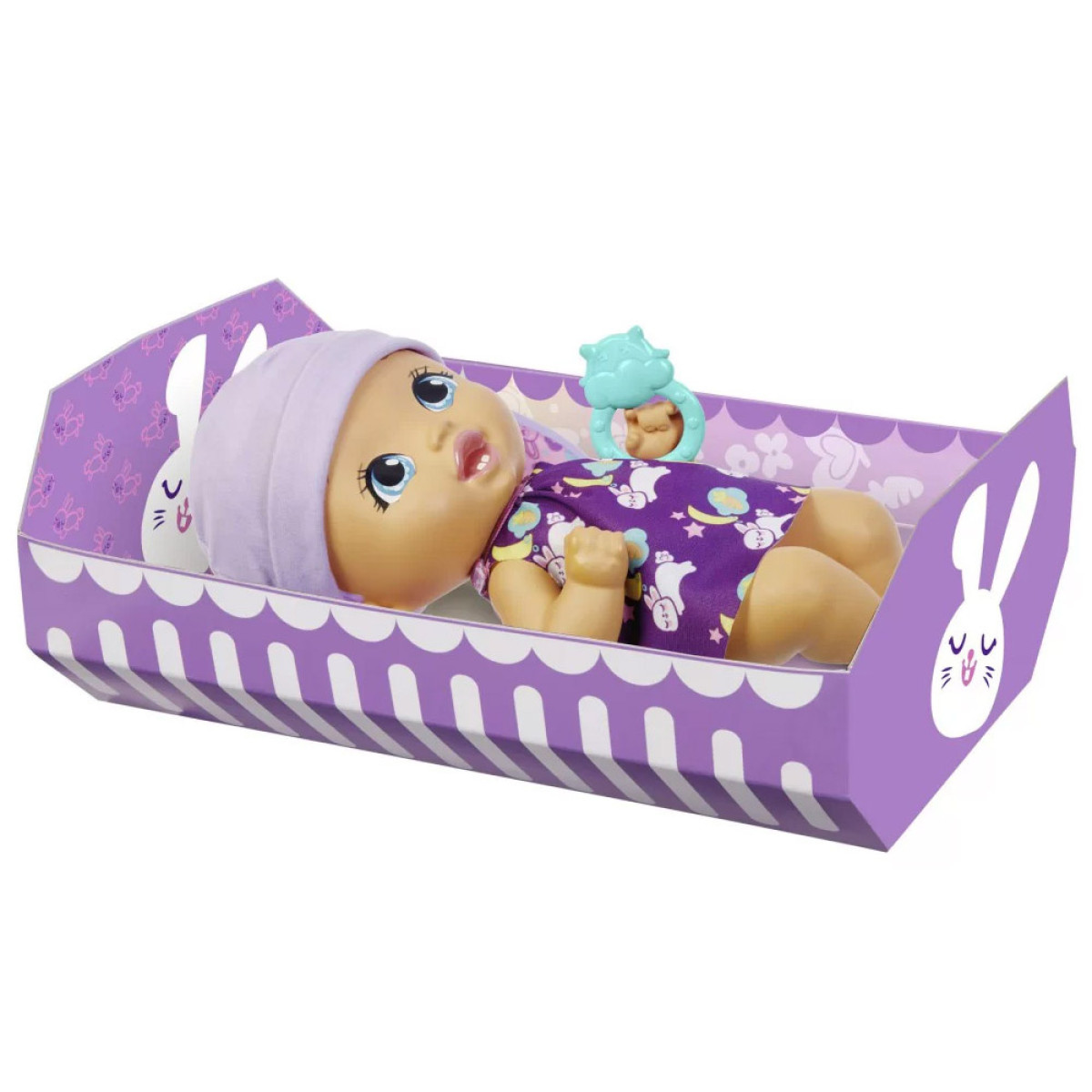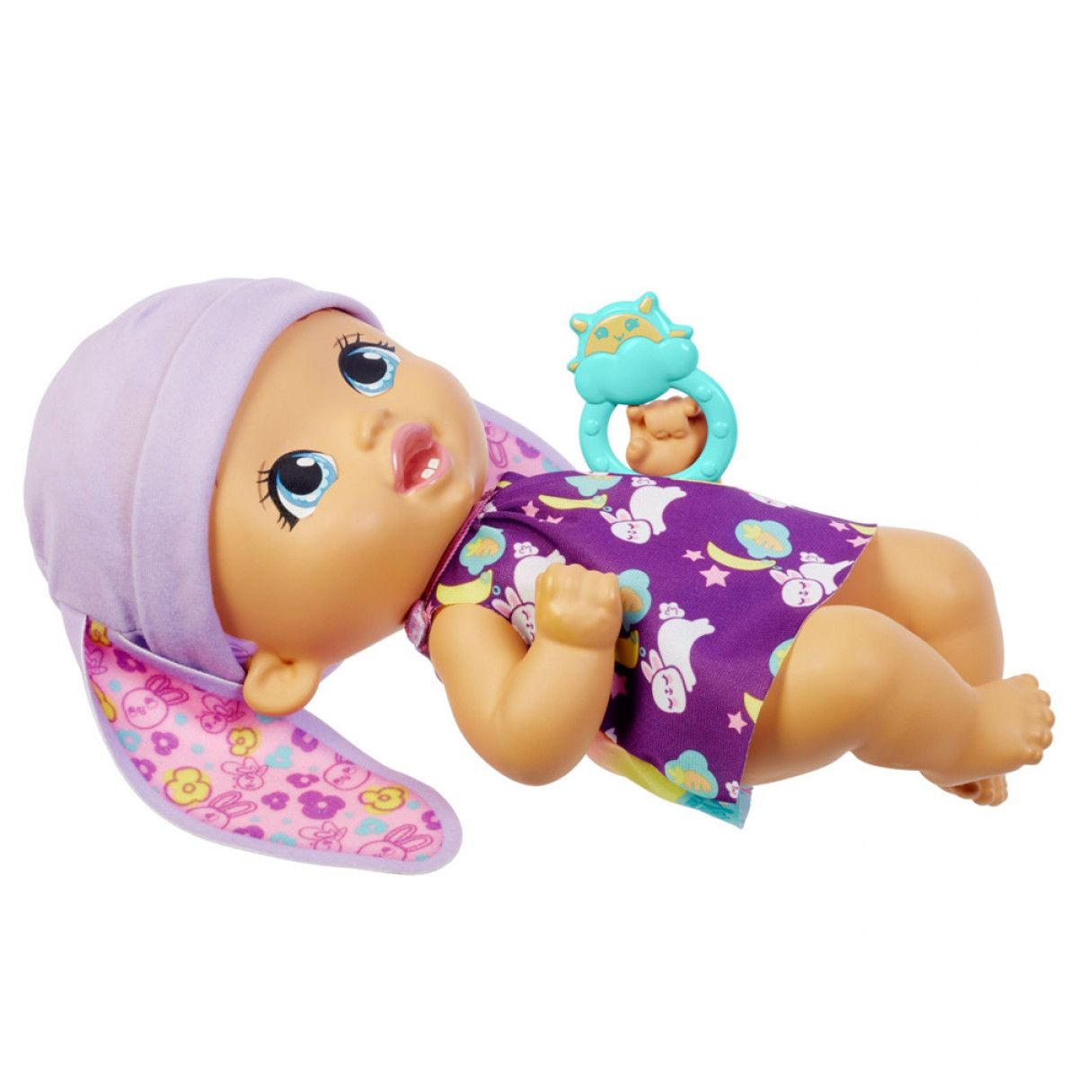Lėlė pagaminta iš plastiko. Jos didelės, mėlynos akys ir miela burnytė patraukia dėmesį. Trumpi, violetiniai plaukai yra papuošti zuikio ausytėmis. Mūsų mažylė yra aprengta miela suknute su zuikučio grafika ir dantų šepetėliu tarp gėlių. Drabužėlį galima nuimti ir pakeisti į naktinę suknutę miegojimui. Apranga naktį virsta tamsia suknele su miegančių mažų zuikučių grafika. Rinkinyje yra būtini priedai rūpinantis kūdikiu.
