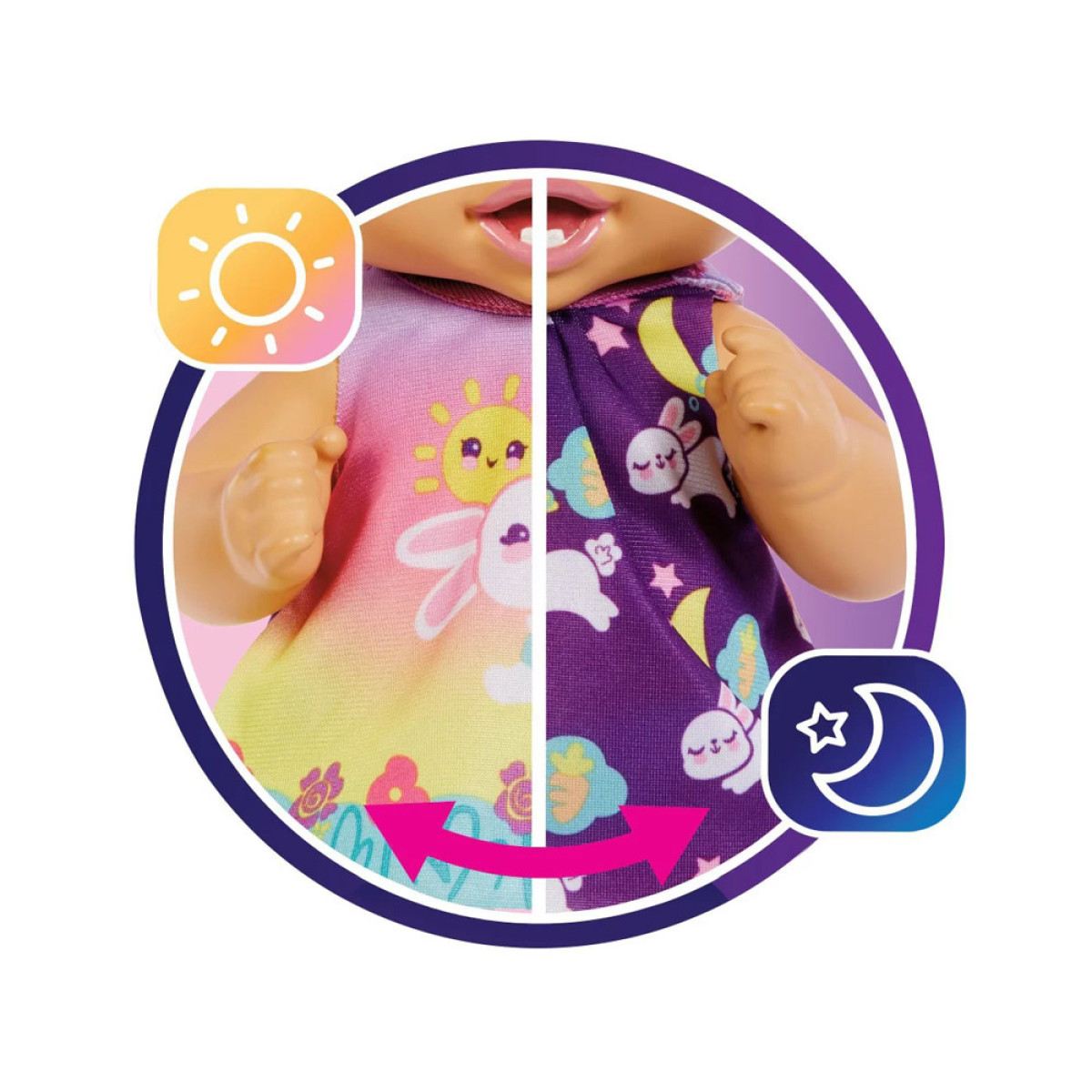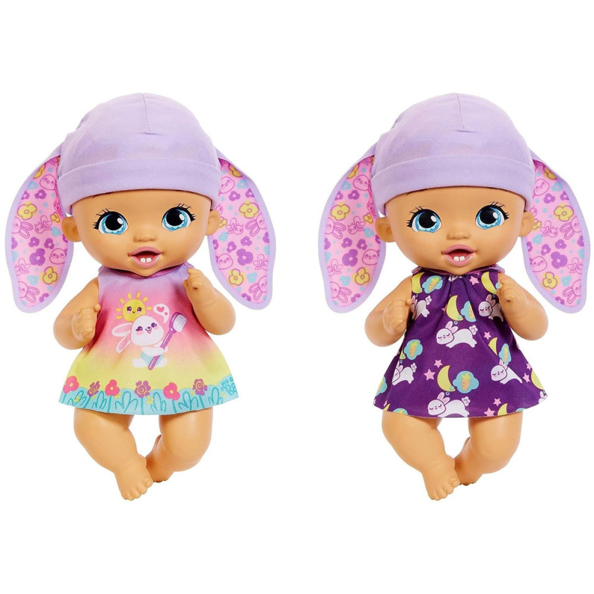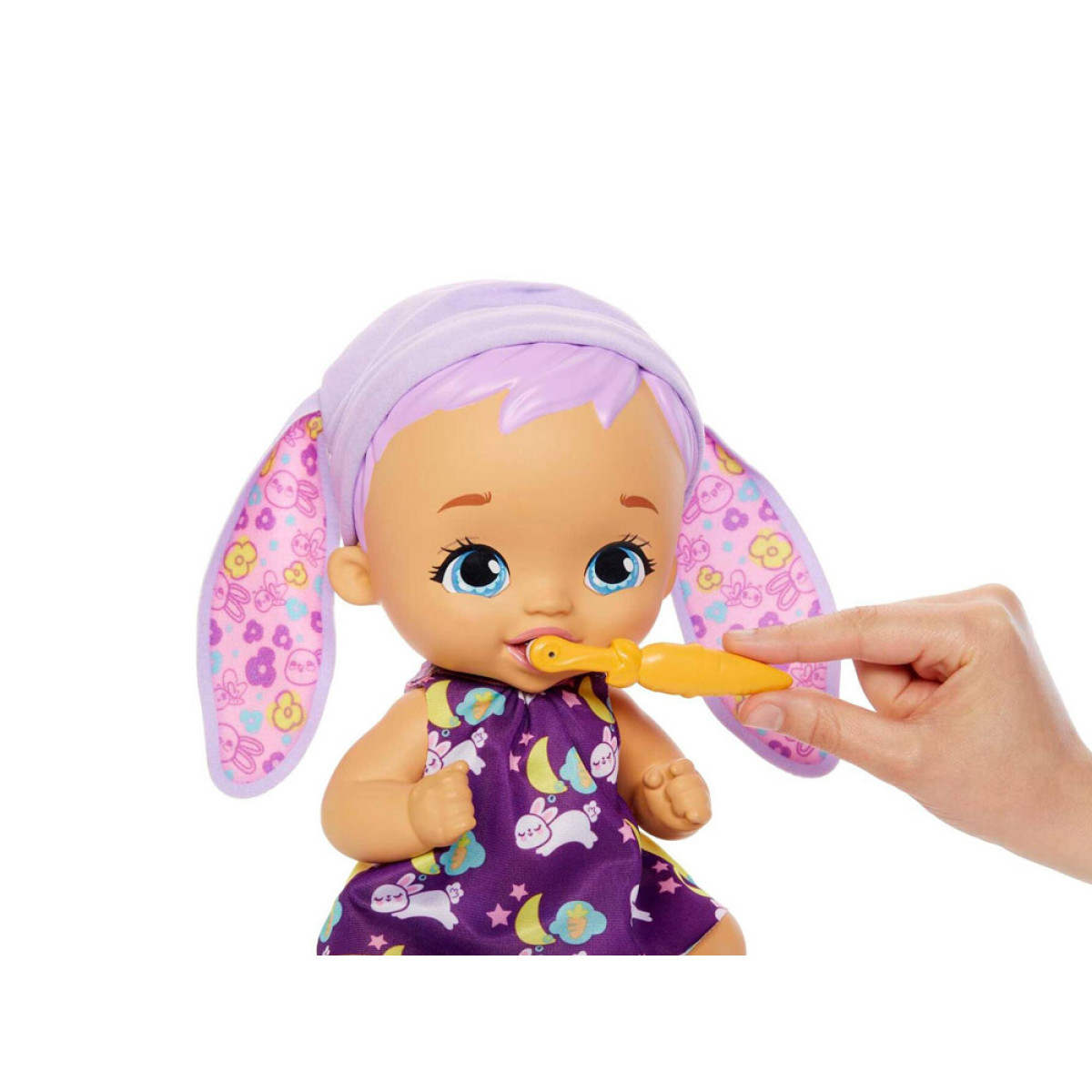 Lėlė pagaminta iš plastiko. Jos didelės, mėlynos akys ir miela burnytė patraukia dėmesį. Trumpi, violetiniai plaukai yra papuošti zuikio ausytėmis. Mūsų mažylė yra aprengta miela suknute su zuikučio grafika ir dantų šepetėliu tarp gėlių. Drabužėlį galima nuimti ir pakeisti į naktinę suknutę miegojimui. Apranga naktį virsta tamsia suknele su miegančių mažų zuikučių grafika. Rinkinyje yra būtini priedai rūpinantis kūdikiu.