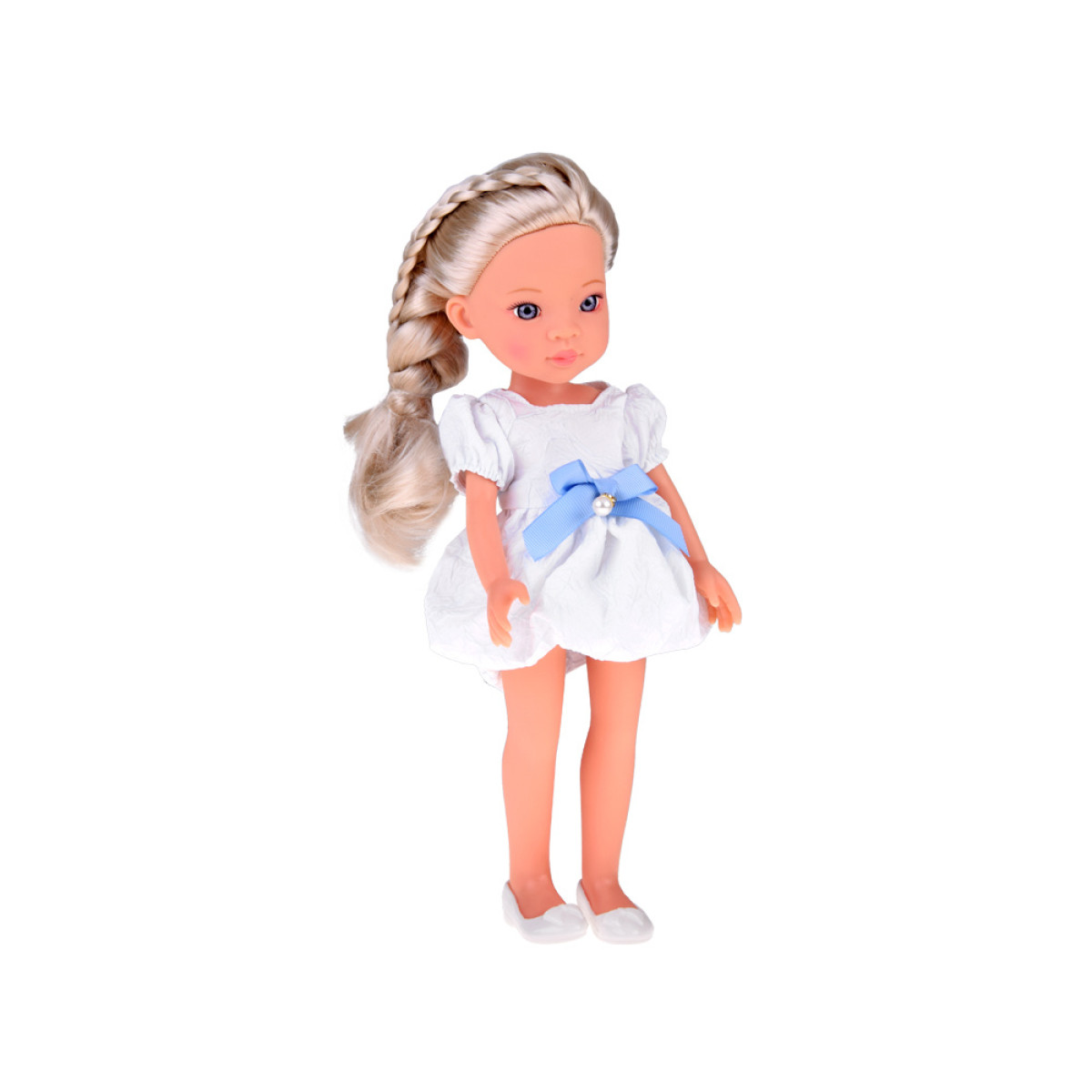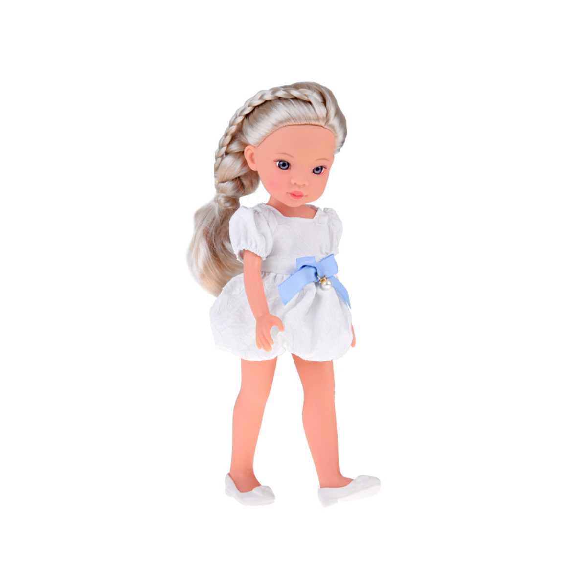 Ši elegantiška lėlė pavergs kiekvieną mergaitę! Ji turi ilgus, šviesius plaukus, supintus į gražią kasą, kuriuos galima šukuoti ir stilizuoti įvairiais būdais. Lėlė vilki gražią, balta suknelę, papuošta mėlyna kaspinėliu ir perline puošmena, bei baltas baletkes, kurios užbaigia jos išskirtinę išvaizdą.