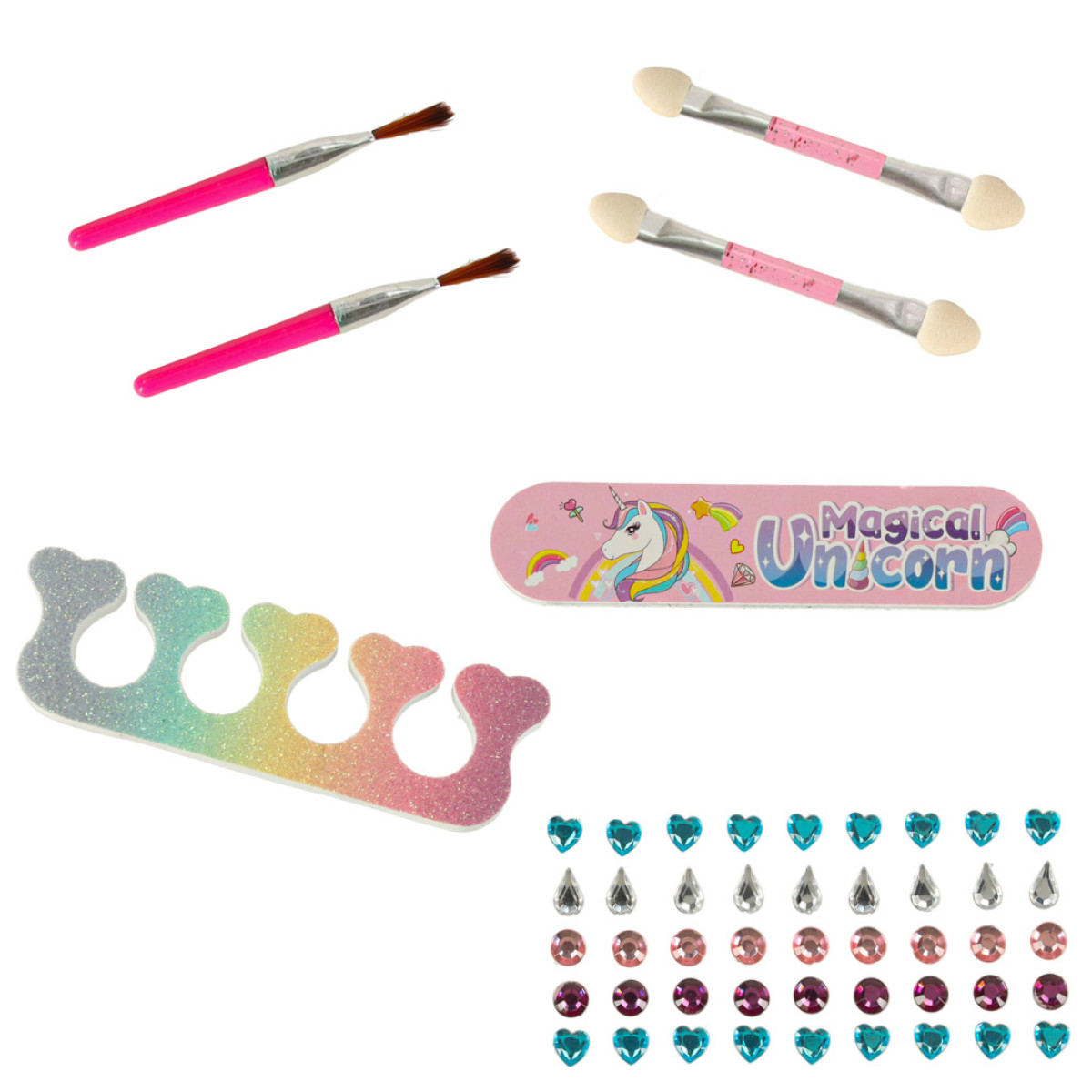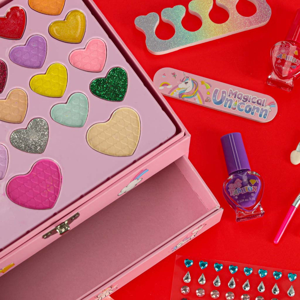 - Elegantiškas dizainas su vienaragiu ir įvairiomis makiažo priemonėmis, kurios yra lengvai nuplaunamos ir pritaikytos jautriai vaikų odai.