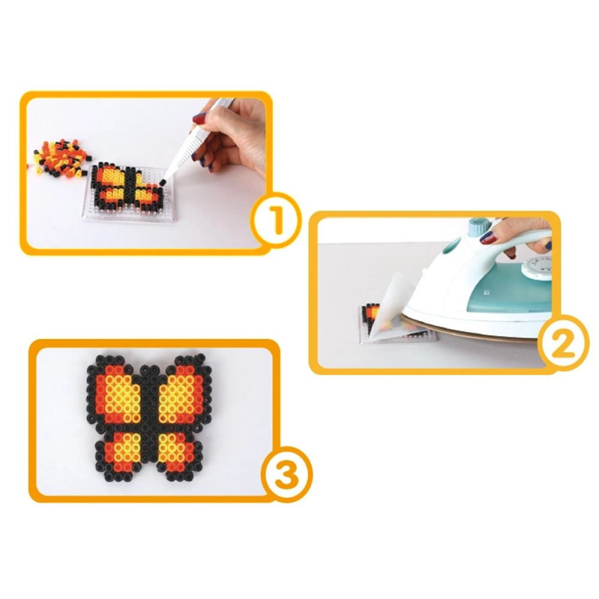 Ant pagrindo išdėliokite pasirinktą šabloną, tada karoliukus išlyginkite lygintuvu per pridėtą popierių (lygintuvas turėtų būti nustatytas vidutinei temperatūrai). Užbaigtą mozaiką padėkite po sunkiu daiktu kelioms minutėms, ir ji bus paruošta!