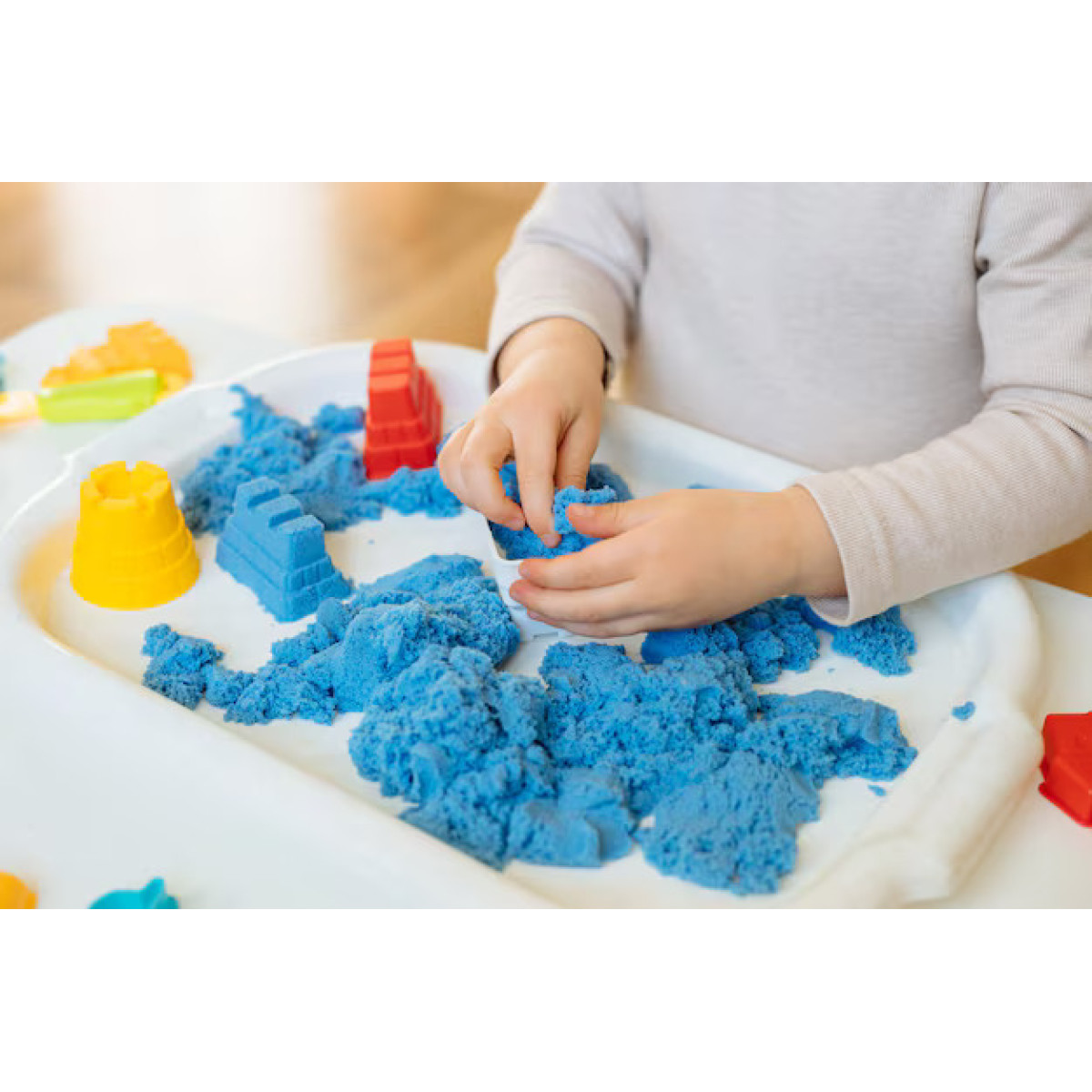 - Lengvas formavimas ir natūralus pojūtis: Smėlis pagamintas taip, kad lengvai laikytų formą ir būtų malonus liesti. Vaikai gali kurti pilis, įvairias figūras ir netgi kurti istorijas su savo kūriniais.