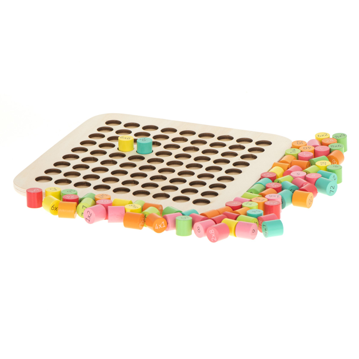 Rinkinyje rasite tvirtą medinę lentą su 81 spalvotu cilindru. Ant kiekvieno cilindro vienoje pusėje pateiktas daugybos veiksmas, o kitoje – teisingas atsakymas. Tai leidžia vaikui mokytis savarankiškai, žaidžiant ir tikrinant save.