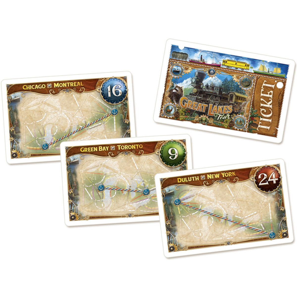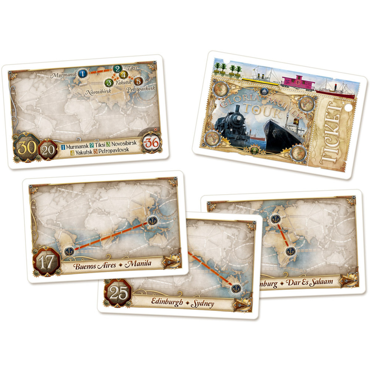 - Bilietai nurodo pradinį ir tikslinį miestus. Žaidėjai turi juos sujungti nenutrūkstamu traukiniu, jūriniu arba mišriuoju maršrutu, priklausomai nuo bilieto kortų.