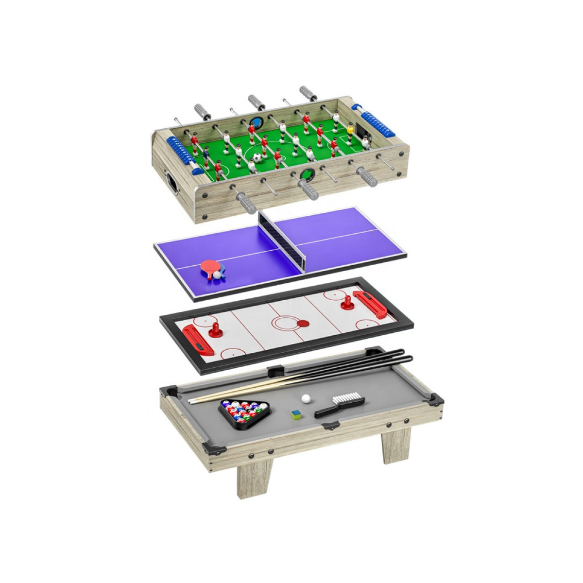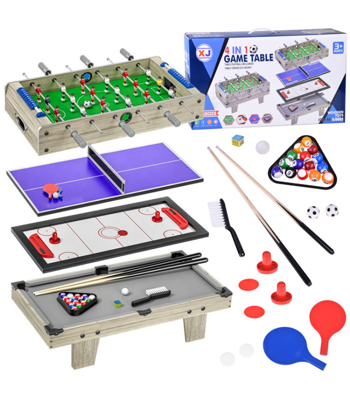 Kasdienį gyvenimą paverskite emocijų kupinu šeimos turnyru! Multifunkcinis stalas 4in1 yra puikus sprendimas vaikams ir suaugusiems, kurie mėgsta aktyvų laisvalaikį ir konkurenciją. Vienas baldas, keturi populiarūs žaidimai – bilardas, stalo futbolas, oro ritulys ir stalo tenisas – garantuoja valandas puikaus laiko praleidimo be išėjimo iš namų.
