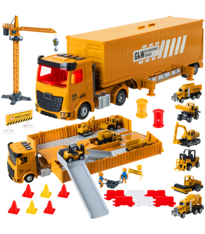 - Medžiagos: ABS (sunkvežimis ir kranas), poliesteris, cinko lydinys, geležis (mažieji automobiliukai)