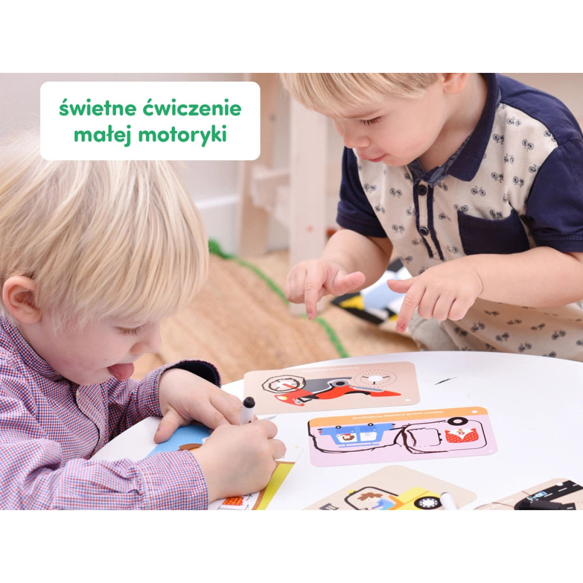 CzuCzu Transporto priemonės Kūrybiniai žaidimai su žymekliu yra edukacinis rinkinys, sudarytas iš knygelės, pilnos sumanių užduočių, ir magiško žymeklio. Spalvingos iliustracijos, vaizduojančios įvairias transporto priemones, įkvepia vaikus kūrybingiems žaidimams. Kortelės leidžia daug kartų piešti ir trinti. Rinkinyje taip pat yra tėvų vadovas su žaidimų idėjomis ir informacija apie vaikų grafomotorinį vystymąsi. Tai puiki edukacinė ir kūrybinė dovana ikimokyklinukui. Puikiai tinka kelionėse su vaiku.