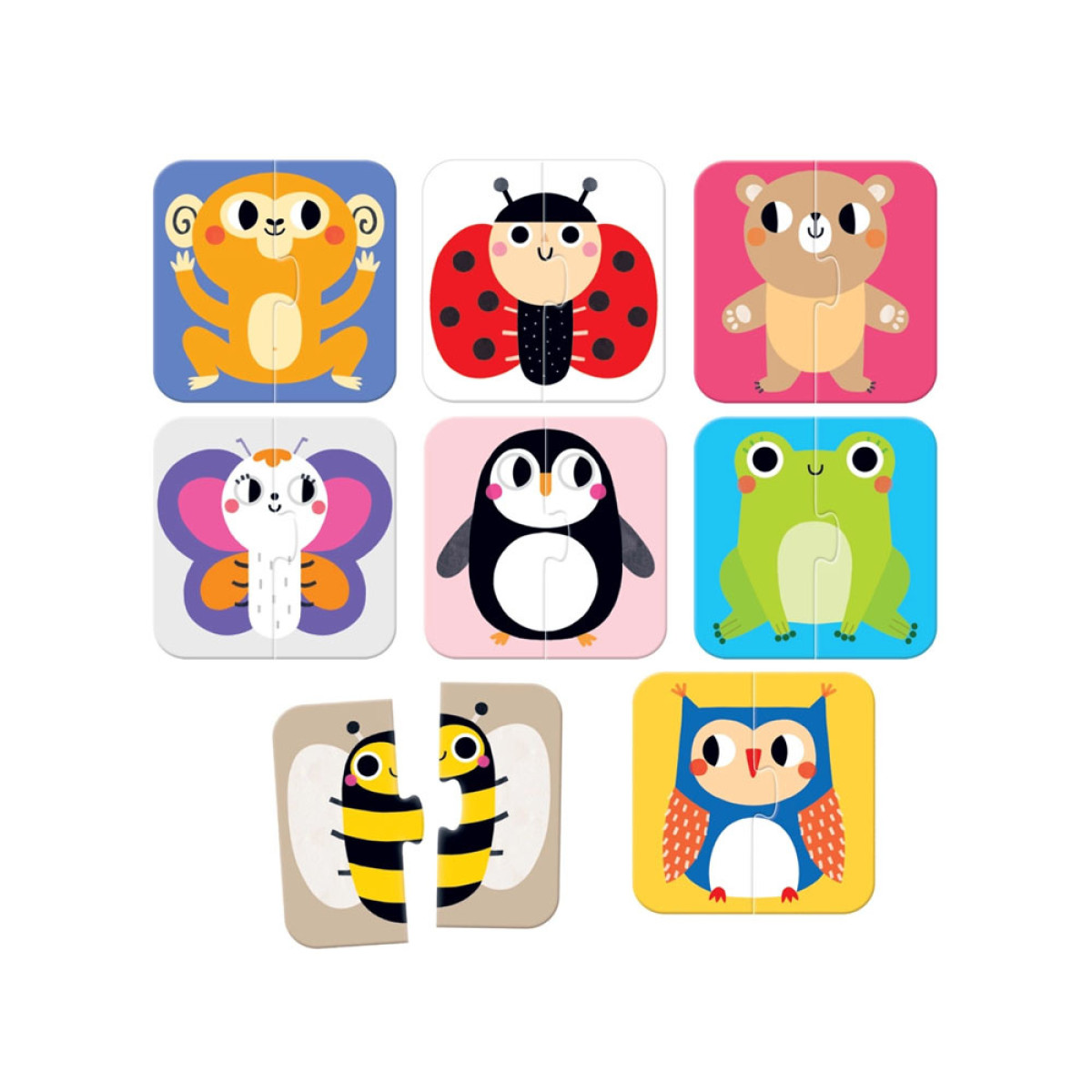 Kokie tai gyvūnėliai? Sujunkite puseles ir sužinokite patys! Dviejų dalių dėlionės puikiai tinka kaip pirmosios dėlionės mažyliams.