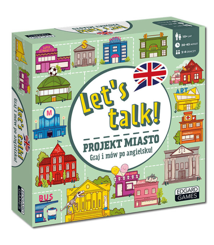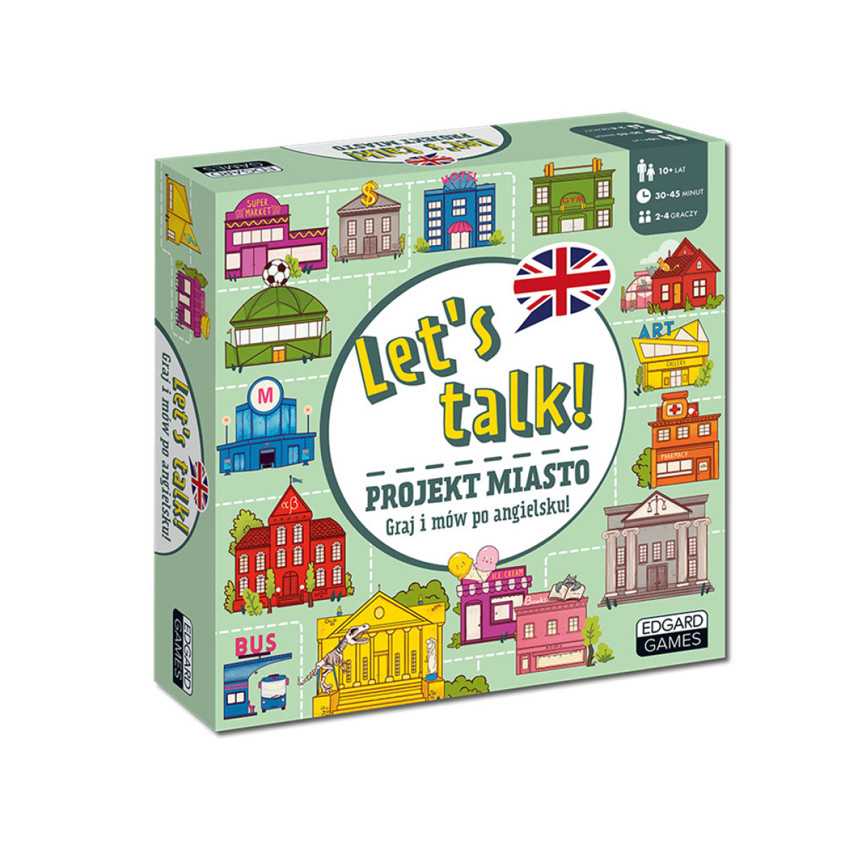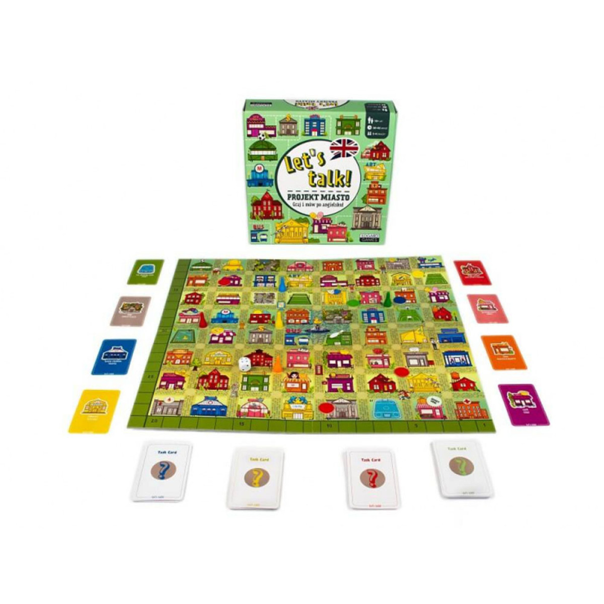 Dėžutėje su žaidimu Let’s Talk. Miesto Projektas rasi: lentelę, kauliuką, 4 pionus, 64 vietų korteles (128 dialogus angliškai), 42 papildomų užduočių korteles (žodžiai, pokalbiai, mįslės) bei 49 žetonus. Kiekvienas žaidimas yra kalbinė pramoga 2-4 žaidėjams nuo 10 metų, kuri užtrunka apie 30-45 minutes.