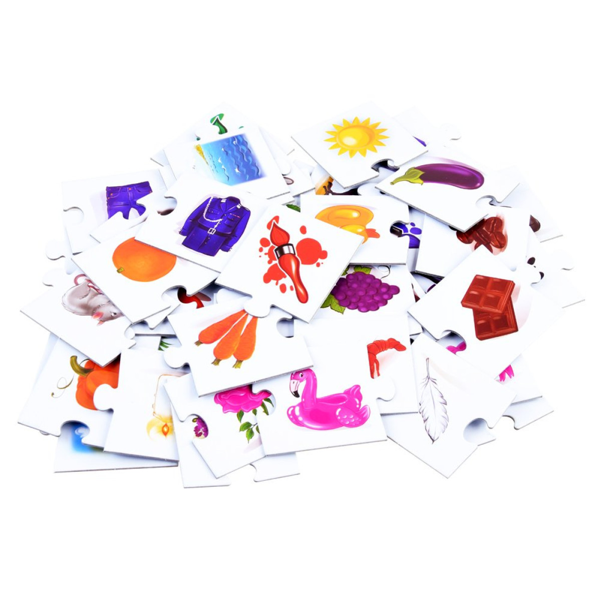 - 12 dėlionių: kiekviena dėlionė susideda iš vieno pagrindinio kortelės su „dėmeliu“ ir trijų dėlionių su paveikslėliais