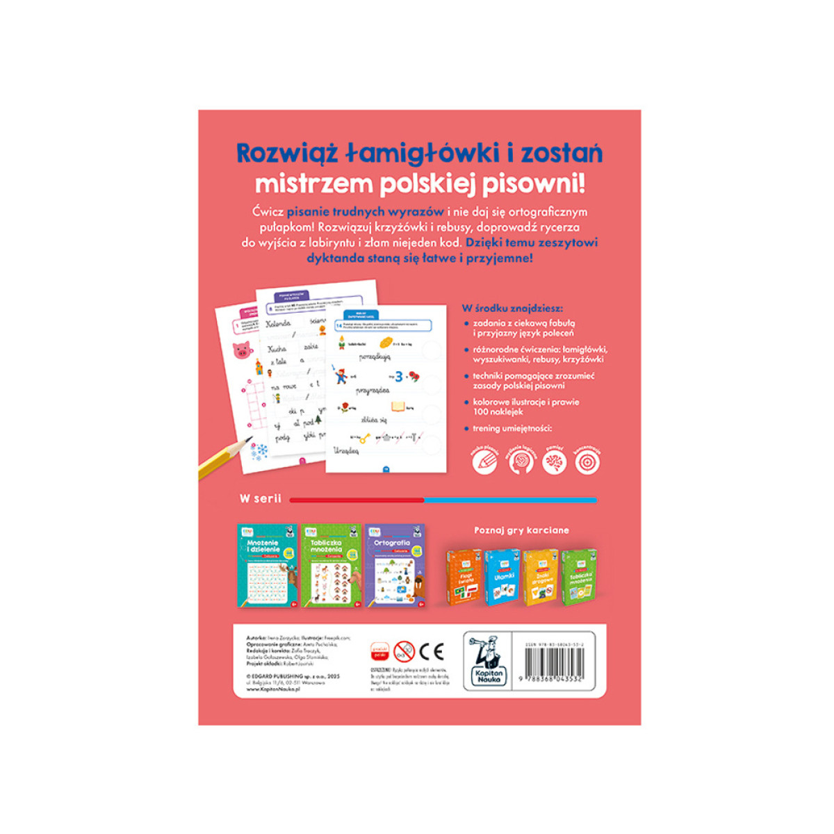 Šis edukacinis sąsiuvinis skirtas 7-11 metų vaikams, padedantis įtvirtinti lenkų kalbos rašybos taisykles patraukliai ir žaismingai. Įvairios užduotys paverčia rašybos mokymąsi malonumu, o diktantai tampa lengvai įveikiami.