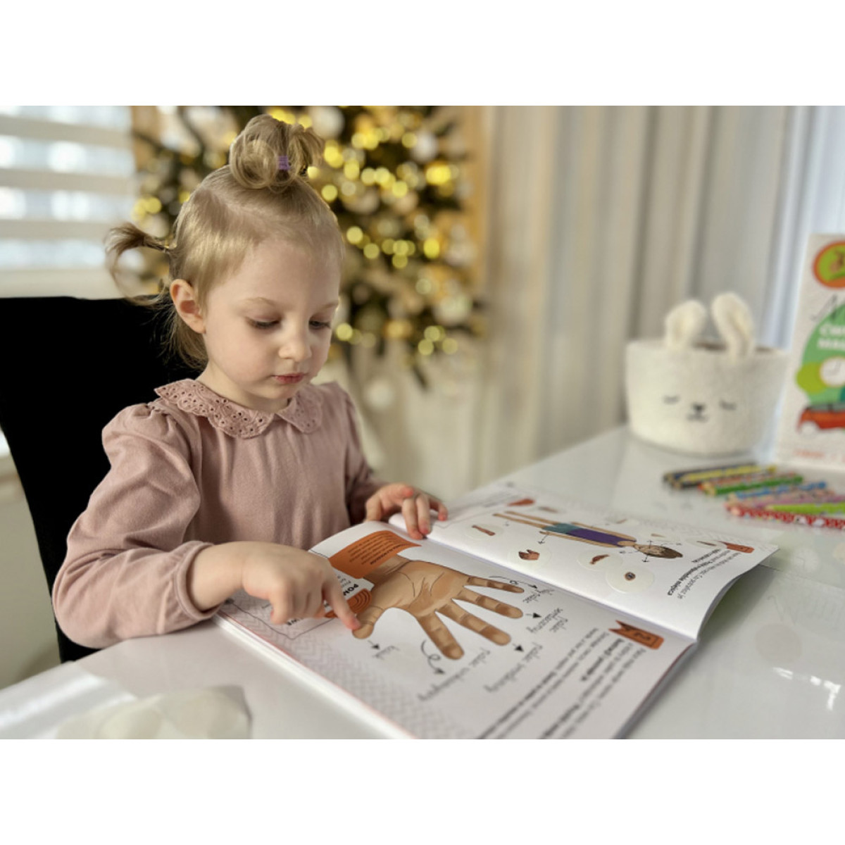 Pilnai iliustruotos užduotys ir įdomybės skatina įgimtą vaiko smalsumą, o kūrybinės medžiagos, tokios kaip lipdukai, spalvingos plokštės ir medžiagos iškirpimui, palengvina savarankišką mokymąsi natūraliausiu būdu – per patirtį ir veiklą.