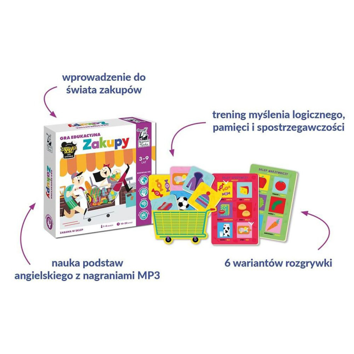 Edukacinis žaidimas Apsipirkimai taip pat moko anglų kalbos pagrindų! Žaidime yra net 6 pramogų variantai su skirtingais sudėtingumo lygiais. Norint tapti nugalėtoju, kartais pakanka greičiausiai užpildyti krepšelį, o kitais kartais reikia įsiminti visus savo pirkinių sąrašo daiktus. Žaidėjų laukia daug iššūkių, kuriuose nėra vietos nuoboduliui! Visi jie leis vaikams lavinti atmintį, dėmesingumą, koncentraciją ir loginį mąstymą, o taip pat mokys bendradarbiavimo su kitais žaidėjais.