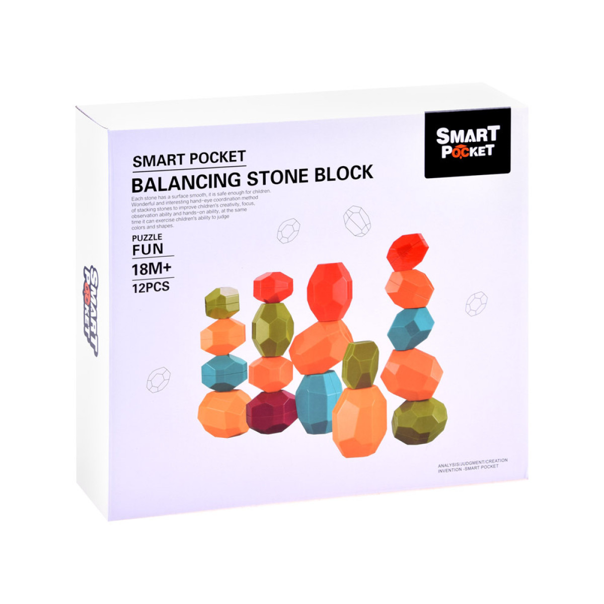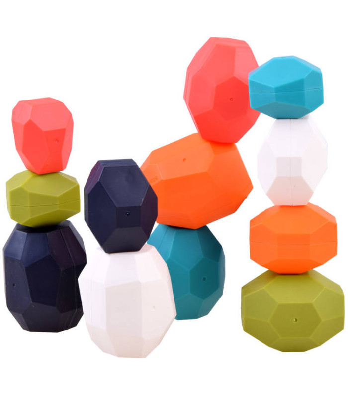 Rinkinyje yra 12 akmenų įvairių dydžių, formų ir spalvų. Kaladėlės pagamintos iš aukštos kokybės plastiko.