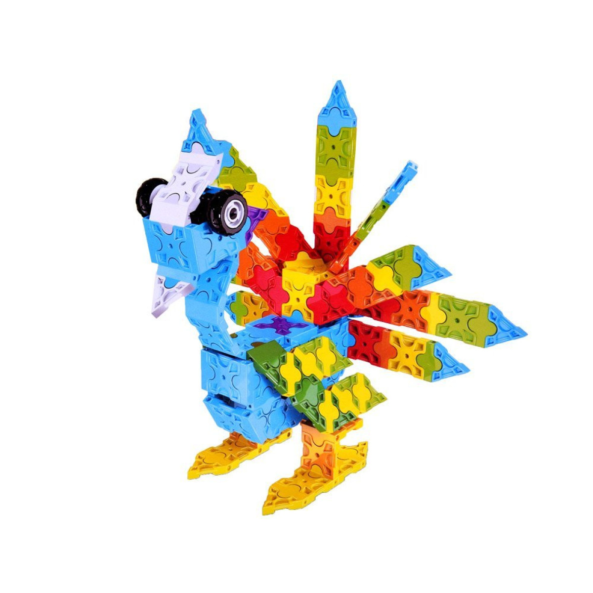 Kūrybinis, spalvotas 3D konstruktorių rinkinys leidžia kurti erdvinius statinius, pavyzdžiui, kaip parodyta ant pakuotės, gražų povą.
