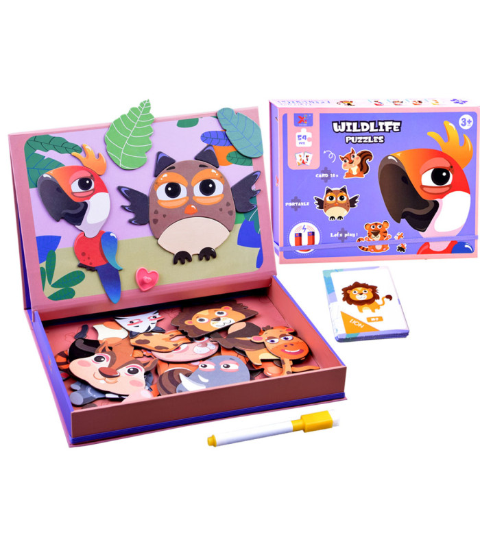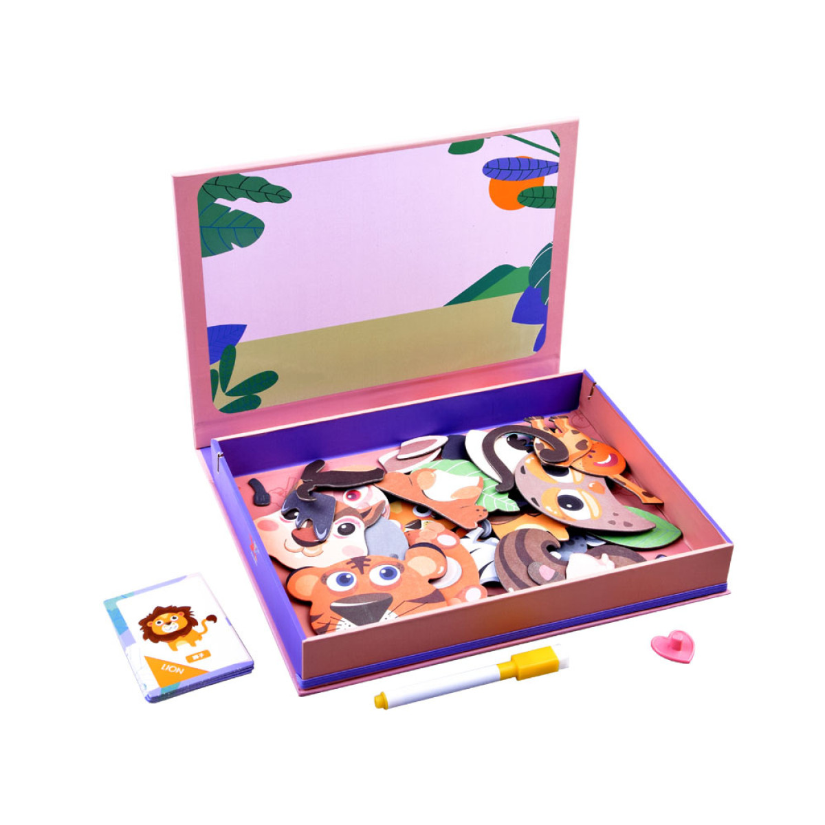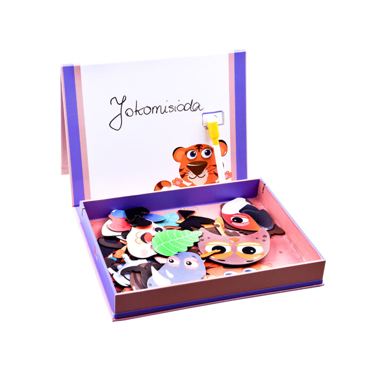 Magnetinė dėlionė gyvūnai yra puiki pramoga mergaitėms ir berniukams. Rinkinys apima spalvotus magnetus, kuriuos galima dėlioti ant magnetinės lentos, todėl žaidimas galimas net kelionės metu. Dėlionė suteikia daug galimybių – be magnetinių dėlionių galima naudoti išlankstomą sausą trynimo lentą ir piešti gražius paveikslėlius pagal savo idėjas arba atkurti gyvūnus iš pridedamų 10 kortų.