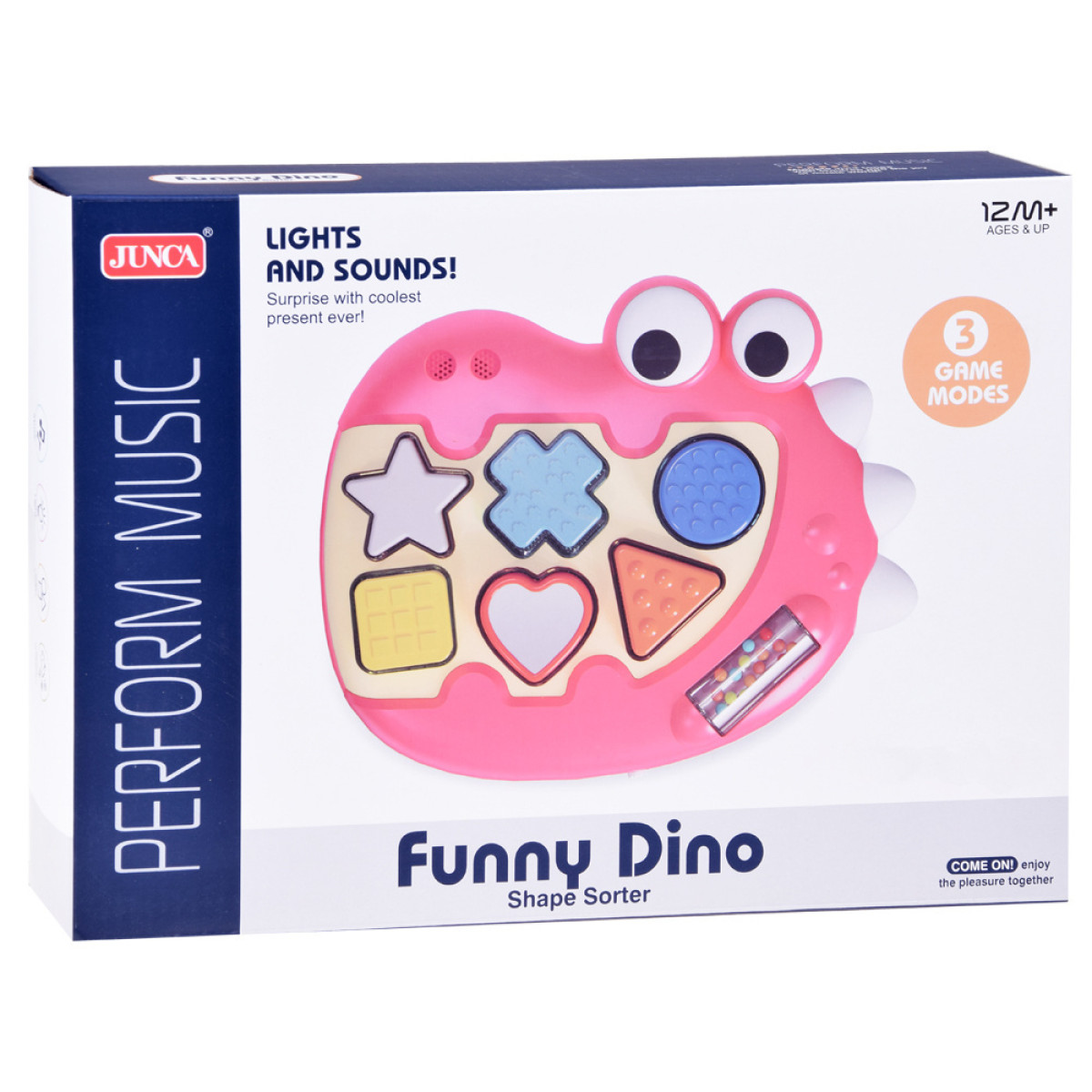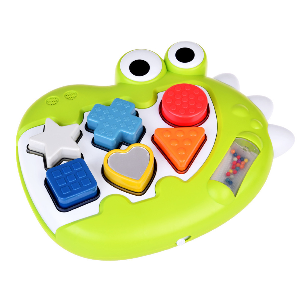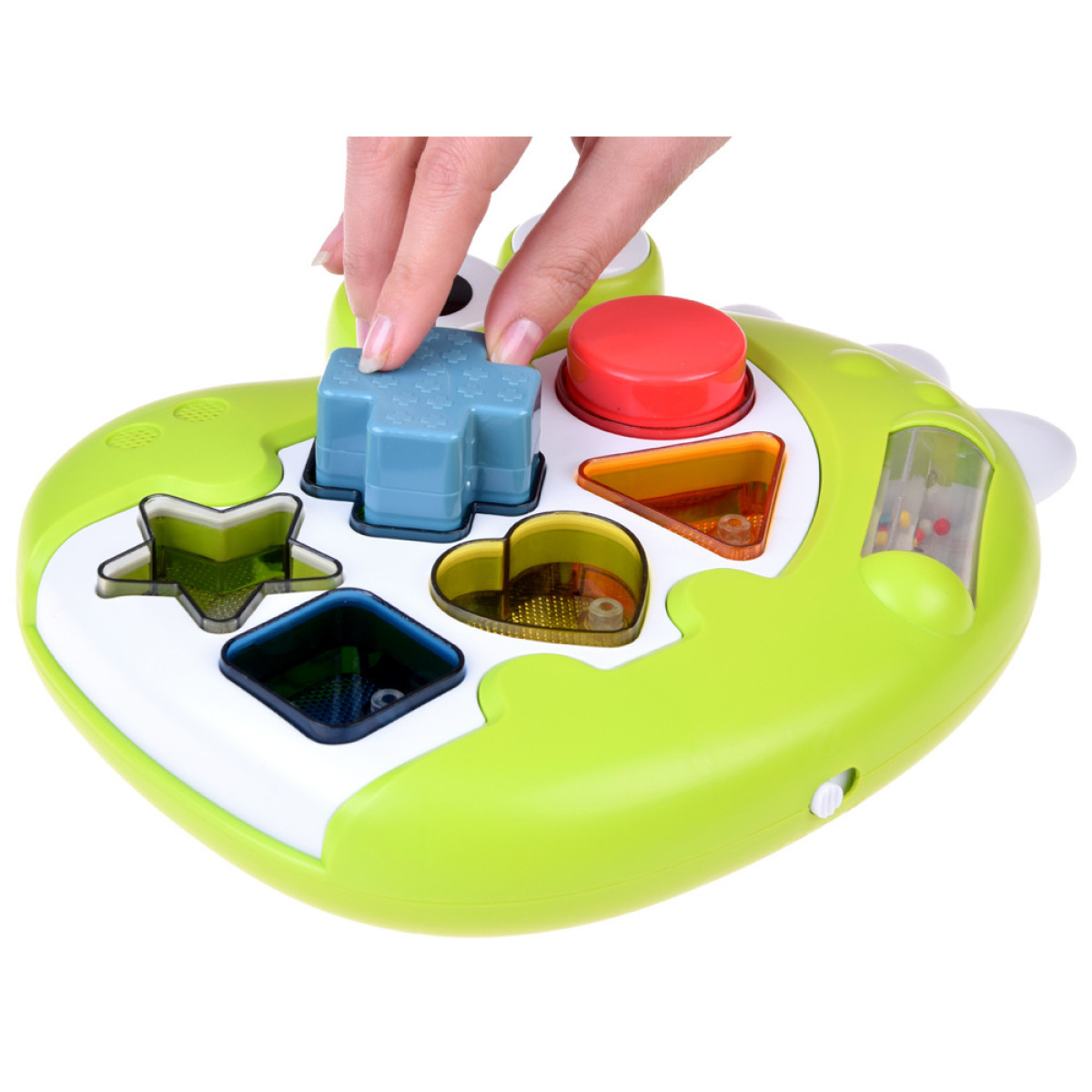 Žaislas yra linksmas žalias dinozauras, turintis 6 formų skyles: trikampio, kvadrato, apskritimo, širdelės, žvaigždutės ir pliuso. Į šias skyles vaikas gali įdėti žaislus, kurie yra rinkinyje. Kiekvienas elementas yra kitokios spalvos ir turi iškilimus, dėl ko žaislas tampa sensorine atrakcija vaikui. Kai kurie elementai turi viduje kamuoliukus, kurie skatina vaiką purtyti juos, kad išgirstų garsą.
