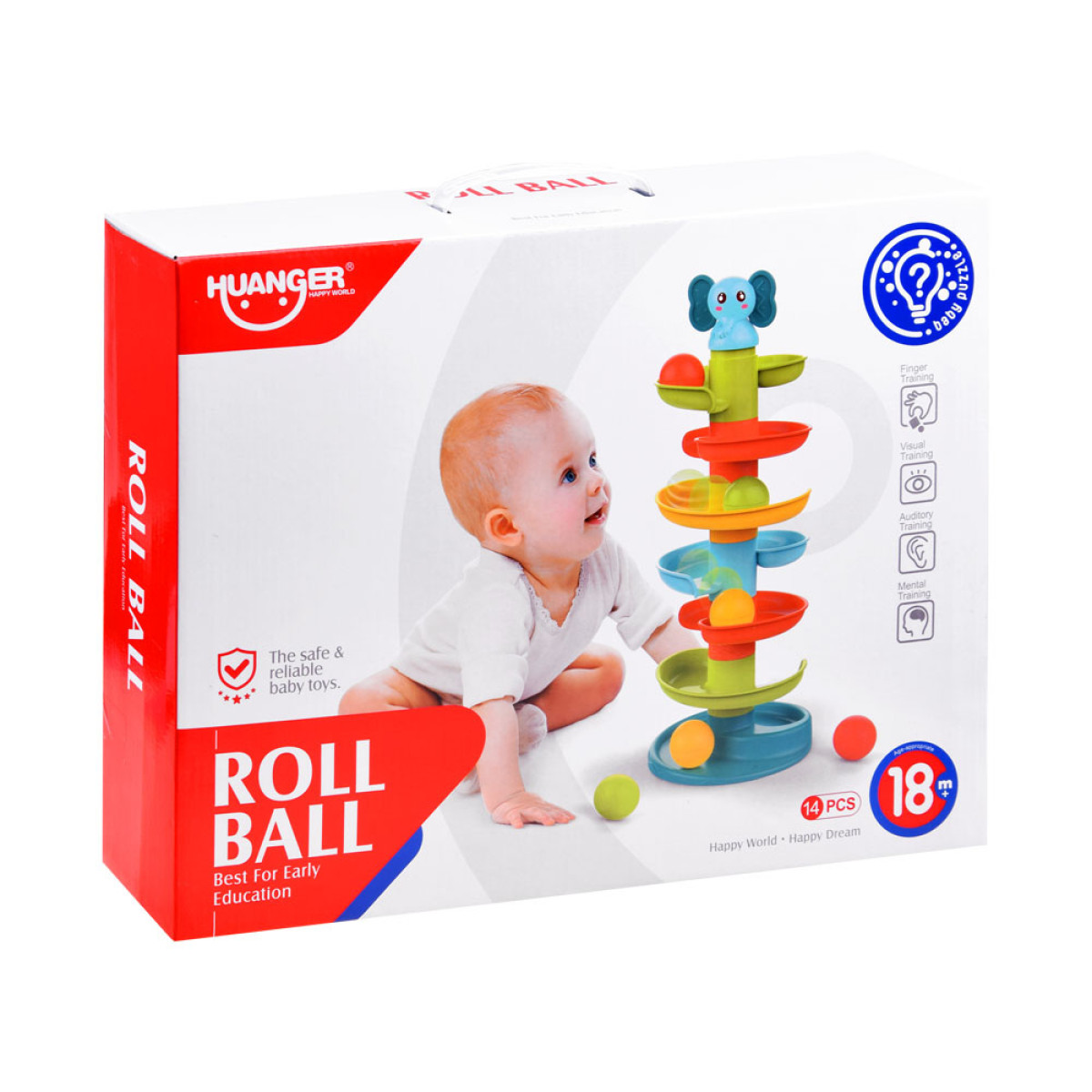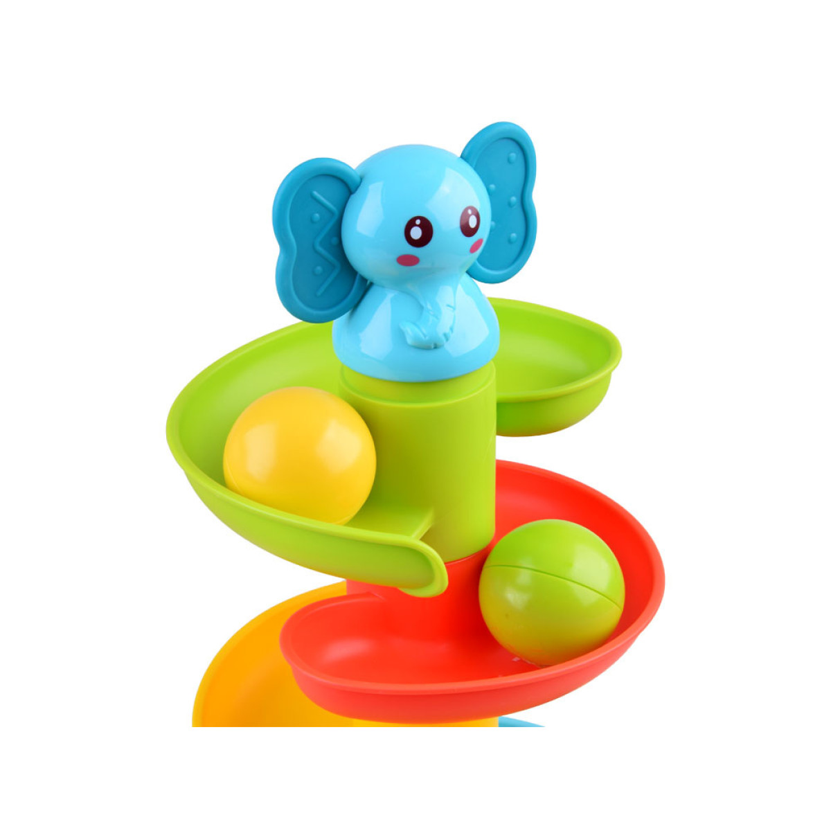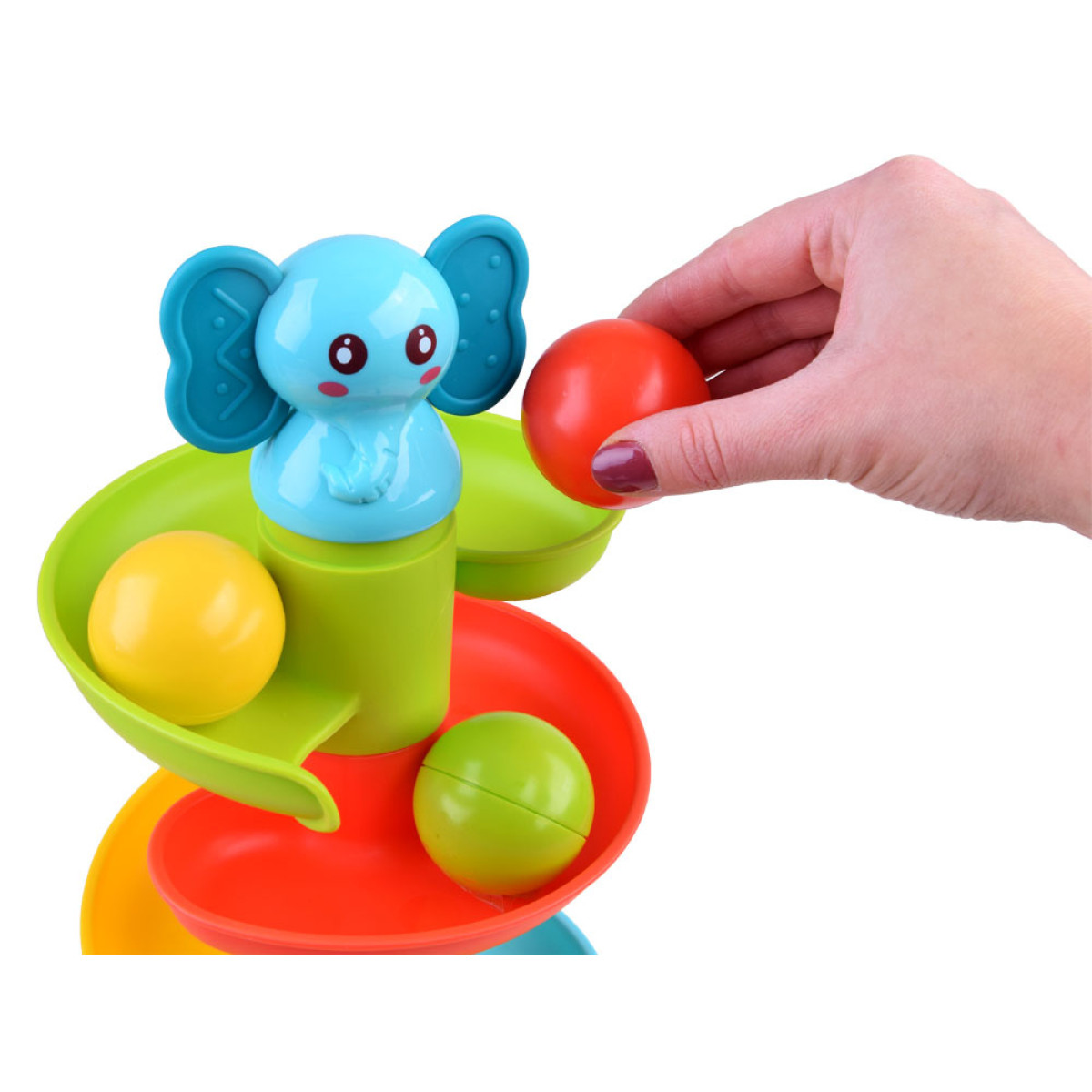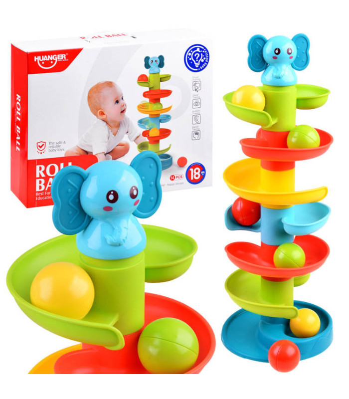 Spalvinga ir vingiuota žaidimų trasa su kamuoliukais yra aukšta bokšto formos konstrukcija, kurios viršuje puikuojasi mielas drambliukas su gumytėmis ausytėmis, kurios gali tarnauti kaip kramtukas vaikams. Ši trasa su kamuoliukais yra puikus pasirinkimas vaikams, mėgstantiems veiksmą ir judėjimą! Spalvinga trasa, sudaryta iš šešių spalvotų platformų, pagrindo ir drambliuko formos dangtelio, suteiks daug džiaugsmo kiekvienam mažyliui.
