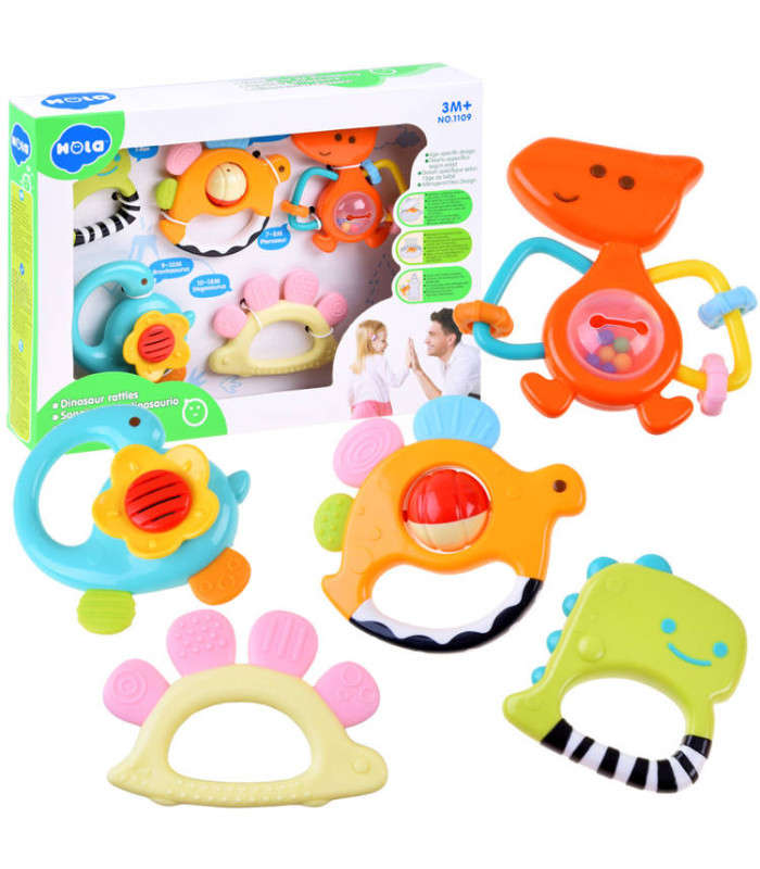 Žavingas 5 spalvotų barškučių ir kramtukų rinkinys