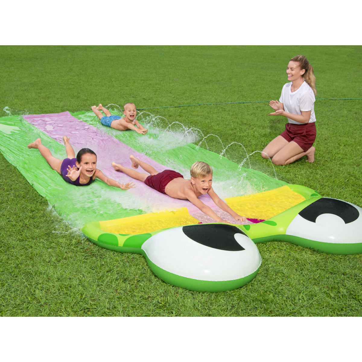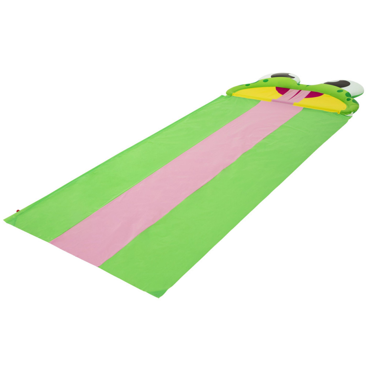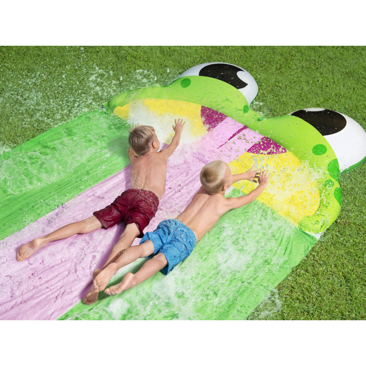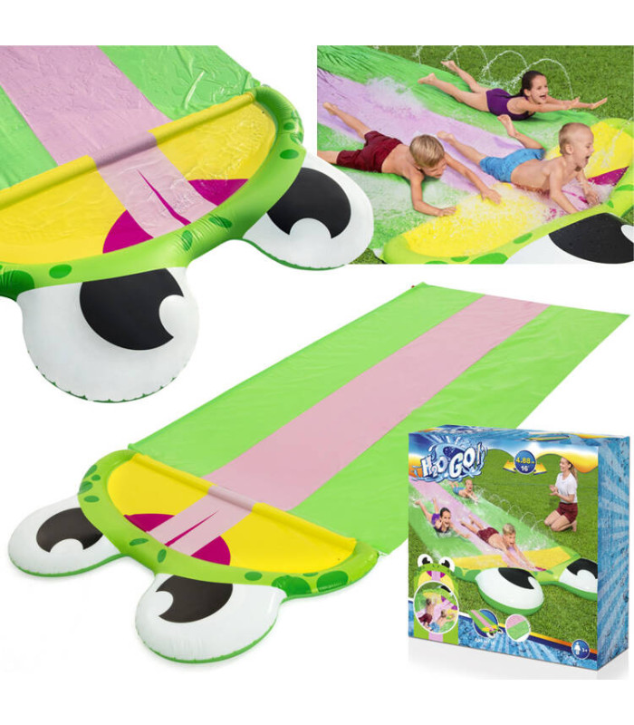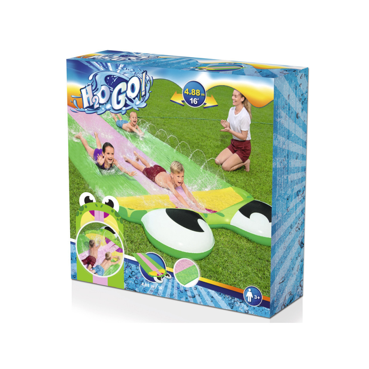 Bestway triguba vandens čiuožykla H2O GO! VARLĖ yra linksmas pasiūlymas vaikams, mėgstantiems aktyviai leisti laiką lauke. Čiuožykla turi platų trijų juostų trasą, kurios ilgis 488 cm, su linksmo varlės atvaizdu finišo linijoje. Trasa yra drėkinama prijungiant sodo žarną prie čiuožyklos įrengtų purkštuvų. Vandens purkštuvai užtikrina maksimalų čiuožimą, tekanti vanduo palaiko čiuožyklos švarą, o vandens srovės suteikia gaivą karštomis dienomis. Dėl išmanios konstrukcijos, tekanti vanduo susikaupia prie pripučiamo finišo, užtikrindama minkštą stabdymą su dideliu pliūpsniu!
