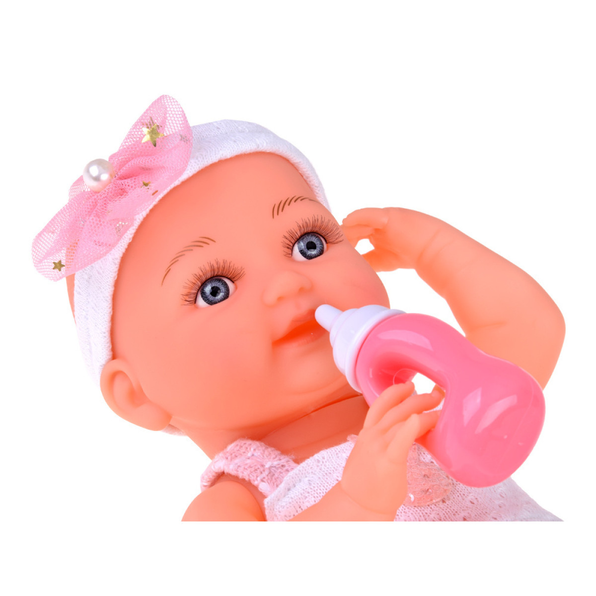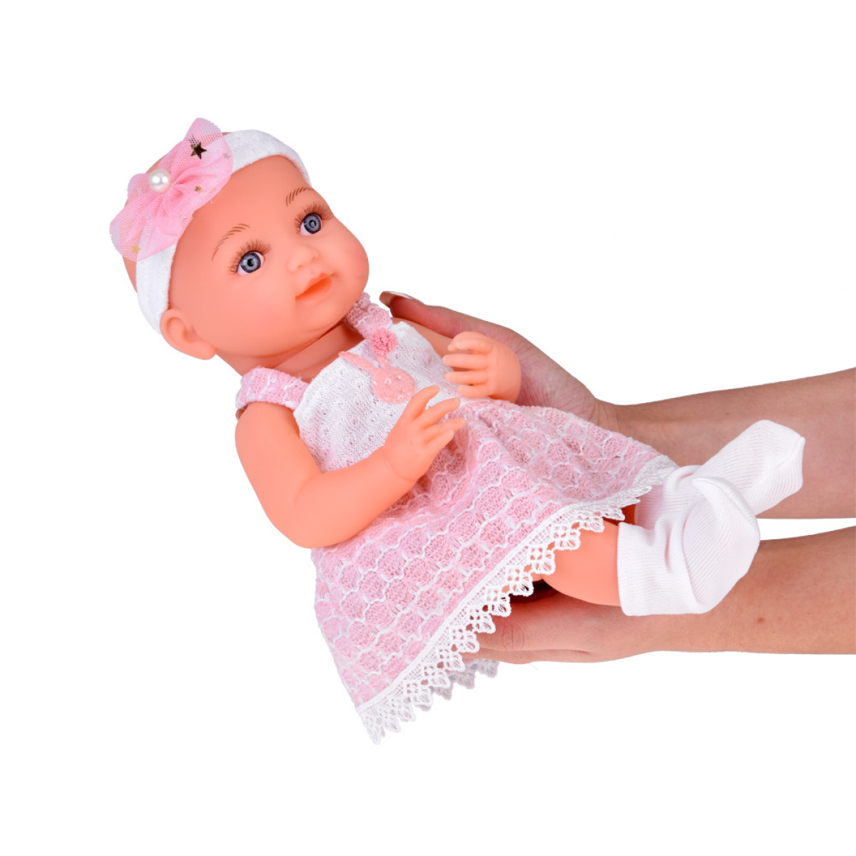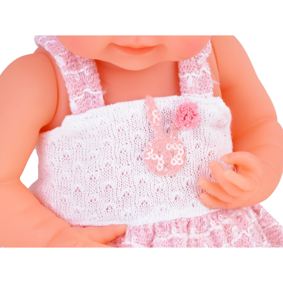 Aukštos kokybės medžiagos: lėlė pagaminta iš tvirtos gumos, atkreipiant dėmesį į detales. Ji turi dideles mėlynas akis, apsuptas ilgų blakstienų. Akys neužsimerkia, o miela lėlės veido išraiška skatina žaisti. Kūdikis aprengtas baltai rožine suknele, papuošta triušiu ir pomponu bei nėriniais. Nors plaukų lėlė neturi, jos galvą puošia tiulio kaspinėlis su perliuku, o ant kojyčių - baltos kojinytės.