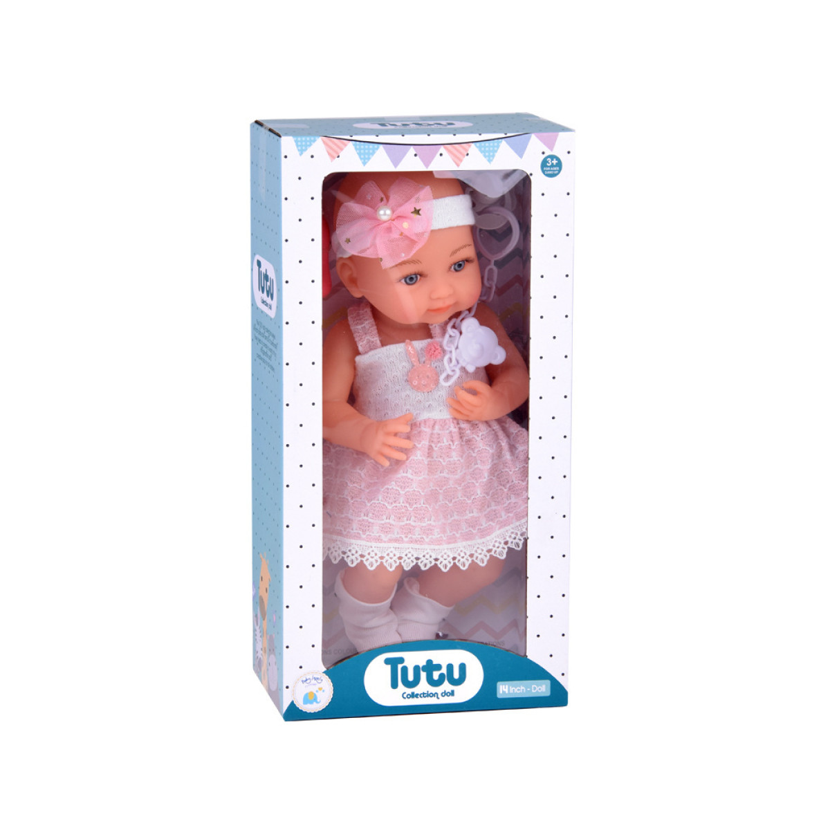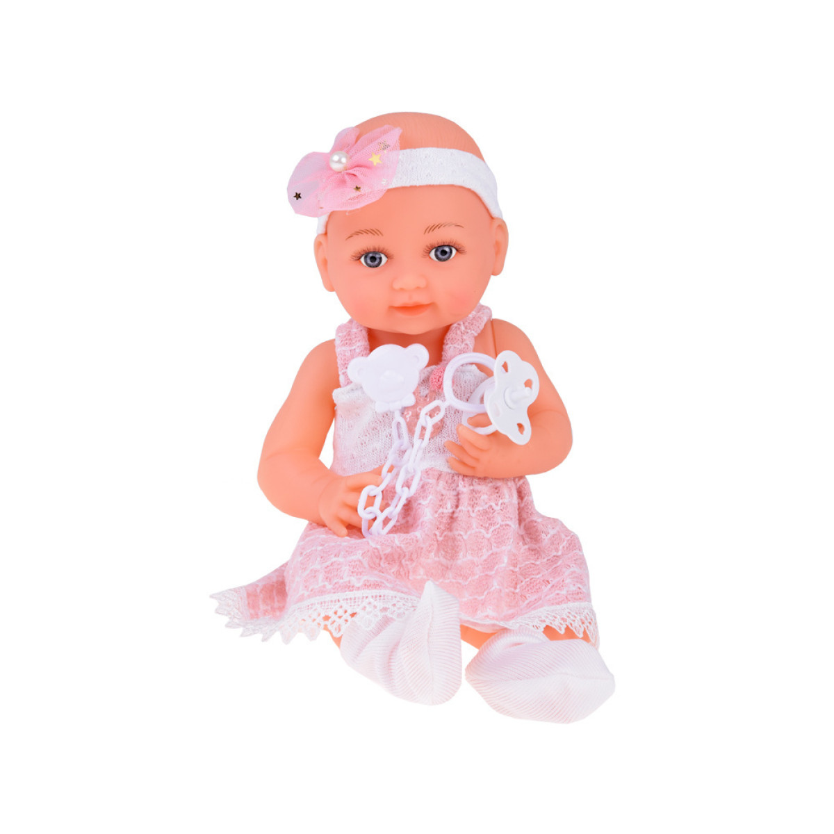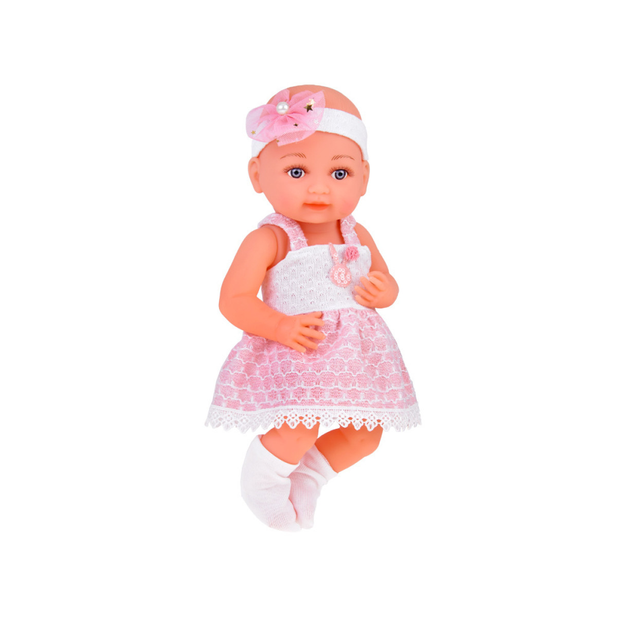 Aukštos kokybės medžiagos: lėlė pagaminta iš tvirtos gumos, atkreipiant dėmesį į detales. Ji turi dideles mėlynas akis, apsuptas ilgų blakstienų. Akys neužsimerkia, o miela lėlės veido išraiška skatina žaisti. Kūdikis aprengtas baltai rožine suknele, papuošta triušiu ir pomponu bei nėriniais. Nors plaukų lėlė neturi, jos galvą puošia tiulio kaspinėlis su perliuku, o ant kojyčių - baltos kojinytės.