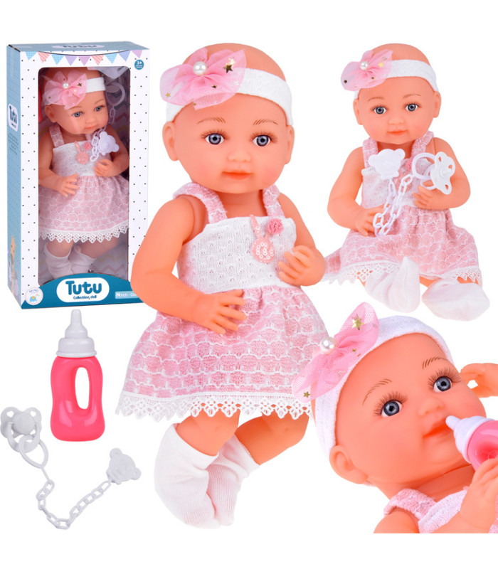 Guminė lėlė kūdikis rožine suknele, buteliukas ir čiulptukas ZA5235