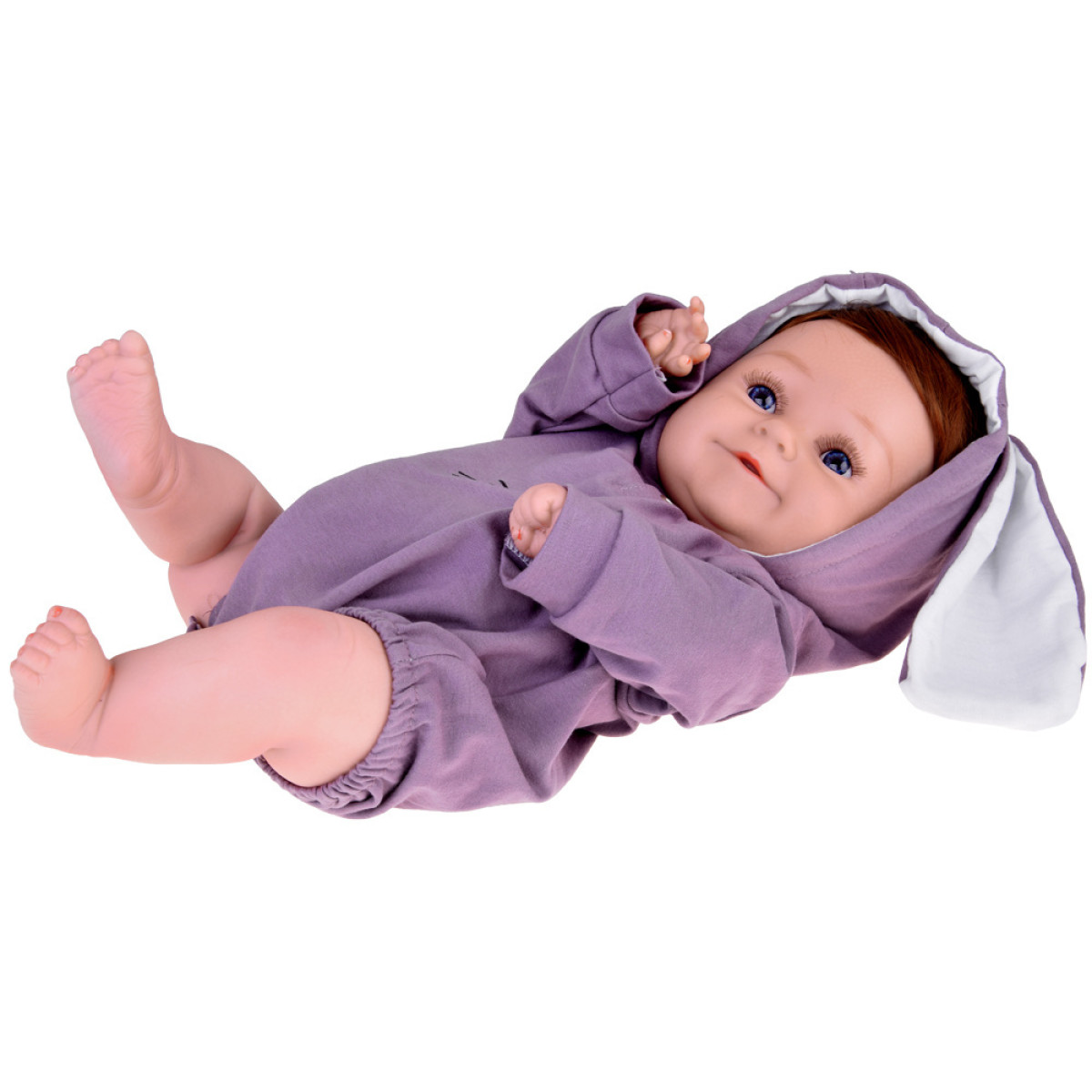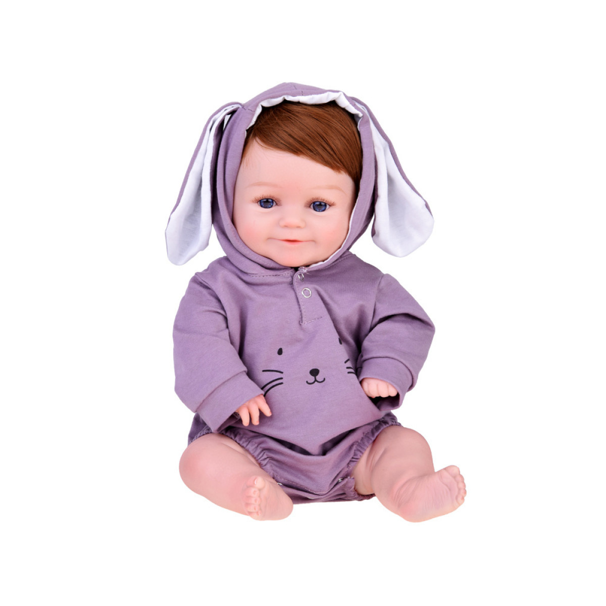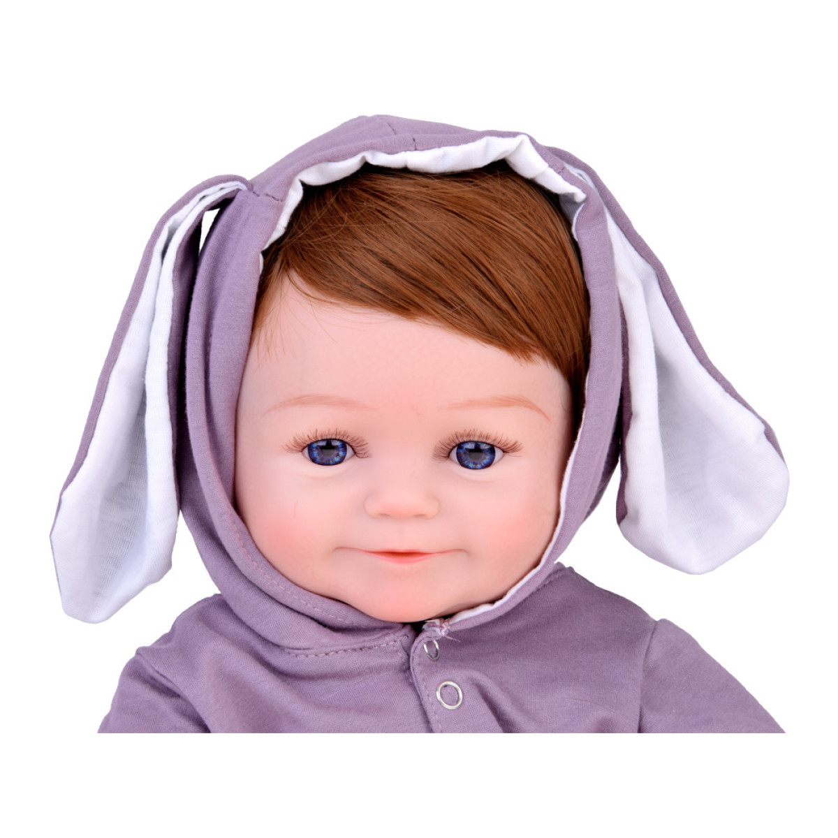 Lėlė aprengta triušiuko kostiumu su gaubtu ramioje spalvoje. Gaubtas papildomai papuoštas ilgomis triušiuko ausimis.