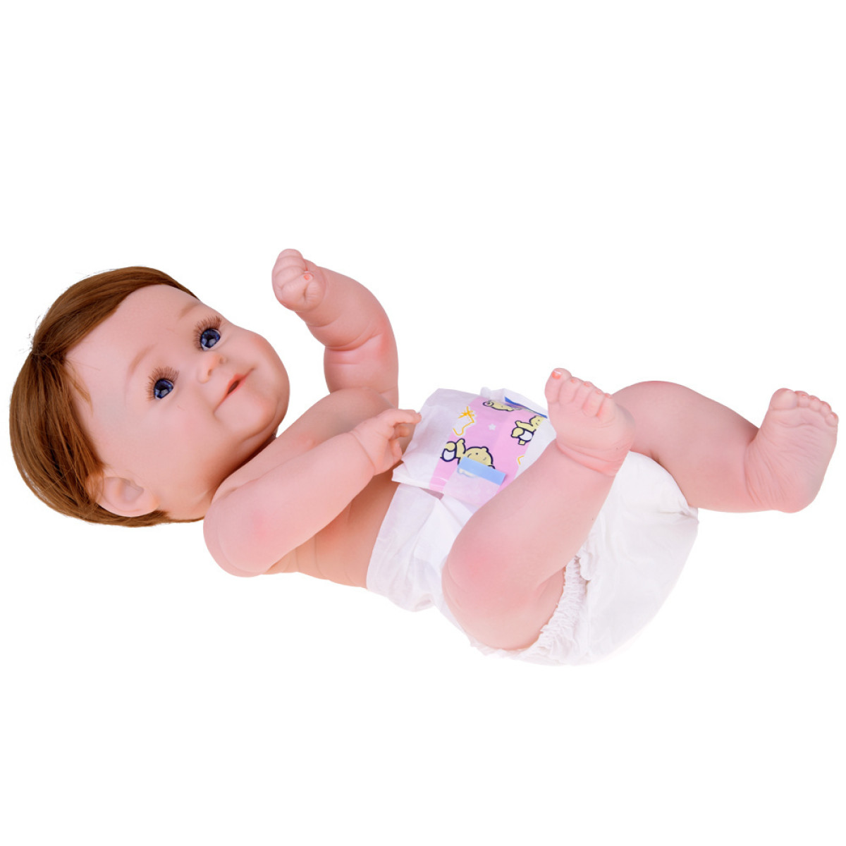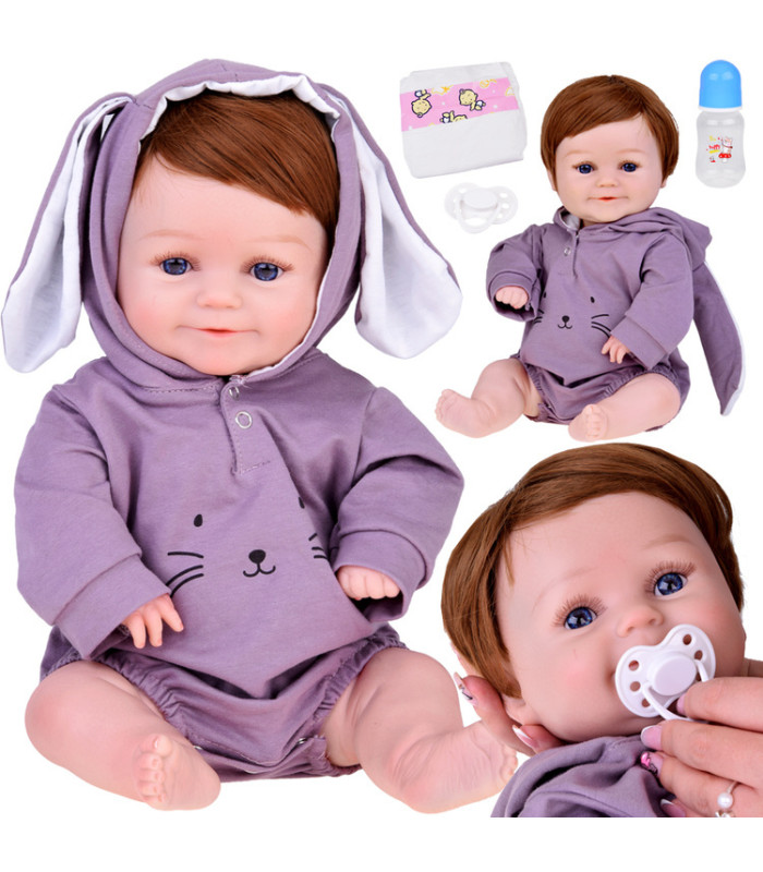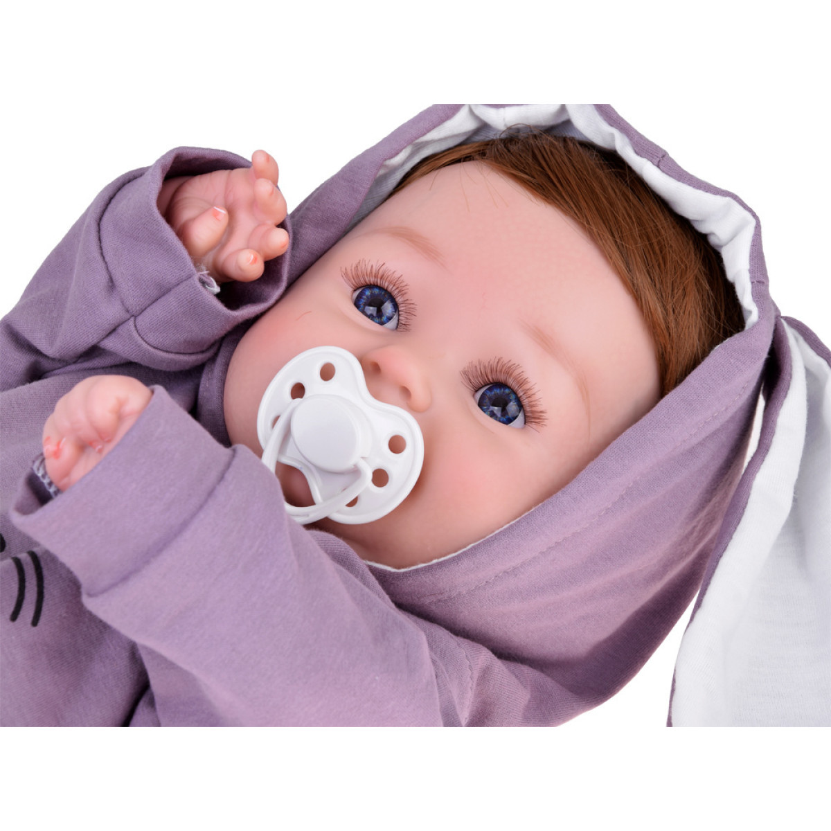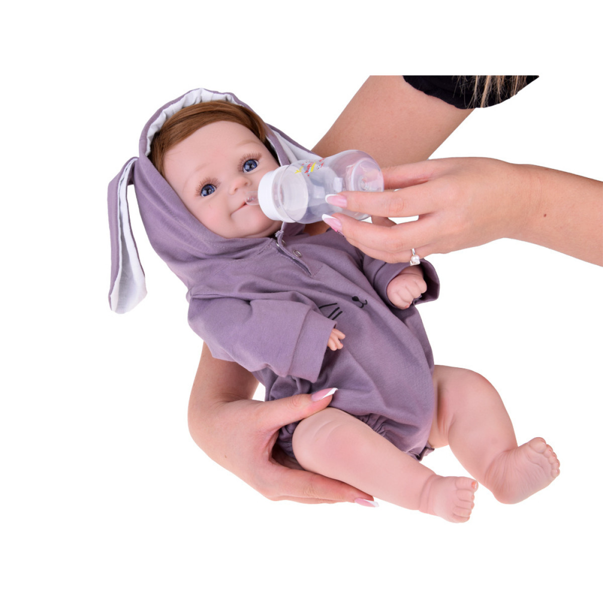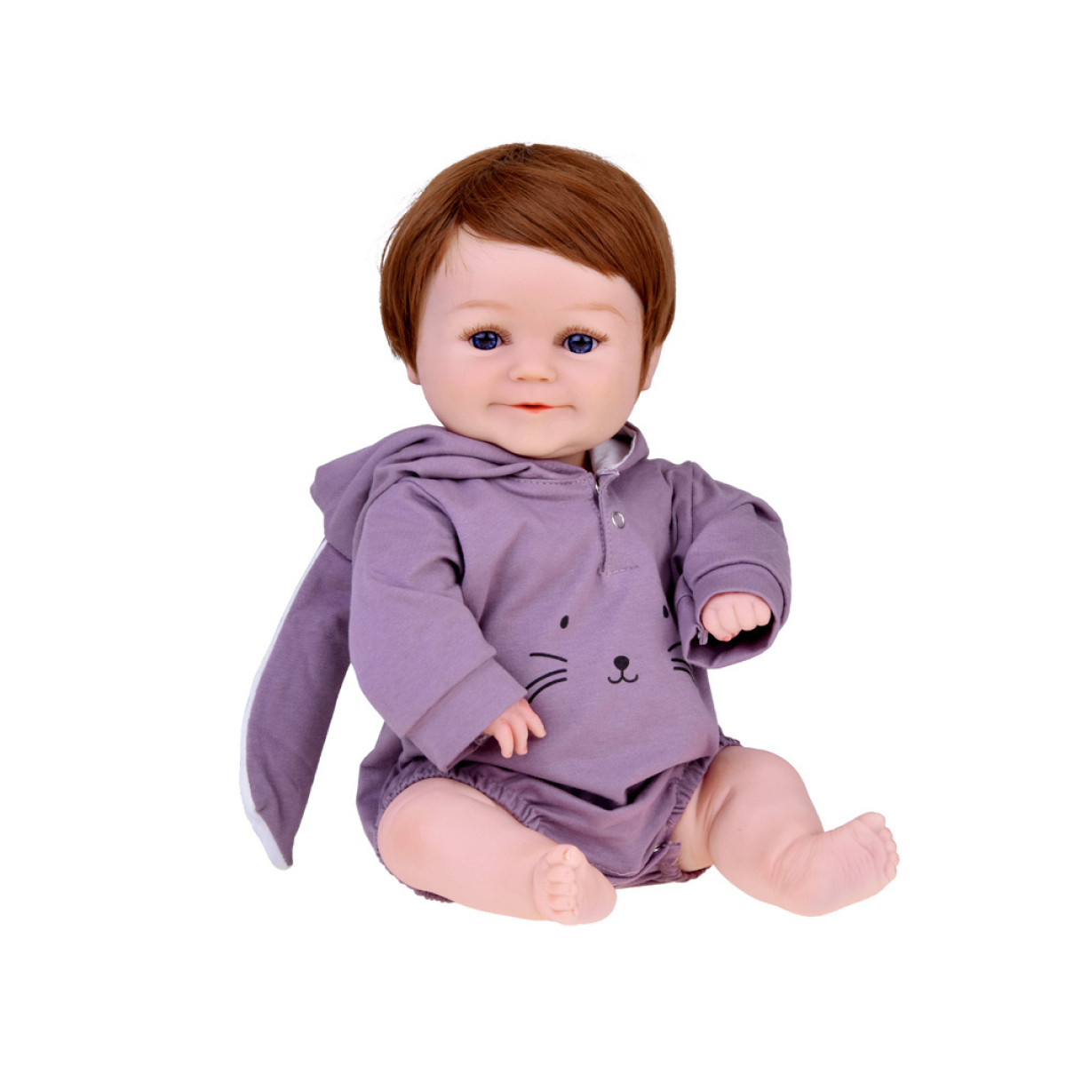 Gražus kūdikis pagamintas iš minkštos gumos, atkreipiant dėmesį į smulkiausias detales, tokias kaip žavios raukšlelės ar realistiškai atvaizduotos akys. Lėlė turi tankius, rudos spalvos plaukus, kurie supa simpatišką veidą. Akys yra didelės ir mėlynos, apsuptos ilgomis blakstienomis. Mažas nosytė ir besišypsantis veidas papildo visą išvaizdą. Lėlės akys nesusimerkia.
