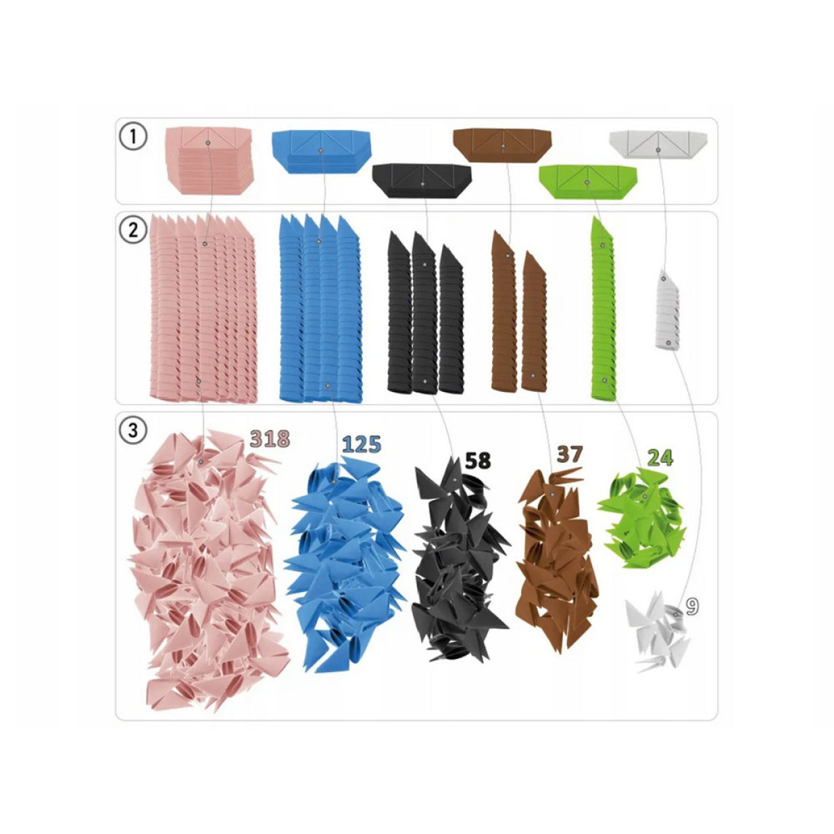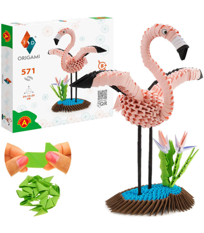 Origami 3D – tai galvosūkis, skirtas vaikų kūrybiškumui ugdyti. Rinkinį sudaro 571 detalė, skirtos 3D flamingo statymui. Origami yra puiki priemonė vaikų ir suaugusiųjų vystymuisi skatinti, nes patobulina mąstymą ir turi terapinį poveikį. Naudojant unikalią technologiją su išryškinta lenkimo linija, galima lengvai sukurti pagrindinį modulį vos per tris paprastus judesius. Visi moduliai sujungiami tarpusavyje be klijų, sukuriant nuostabų meno kūrinį.