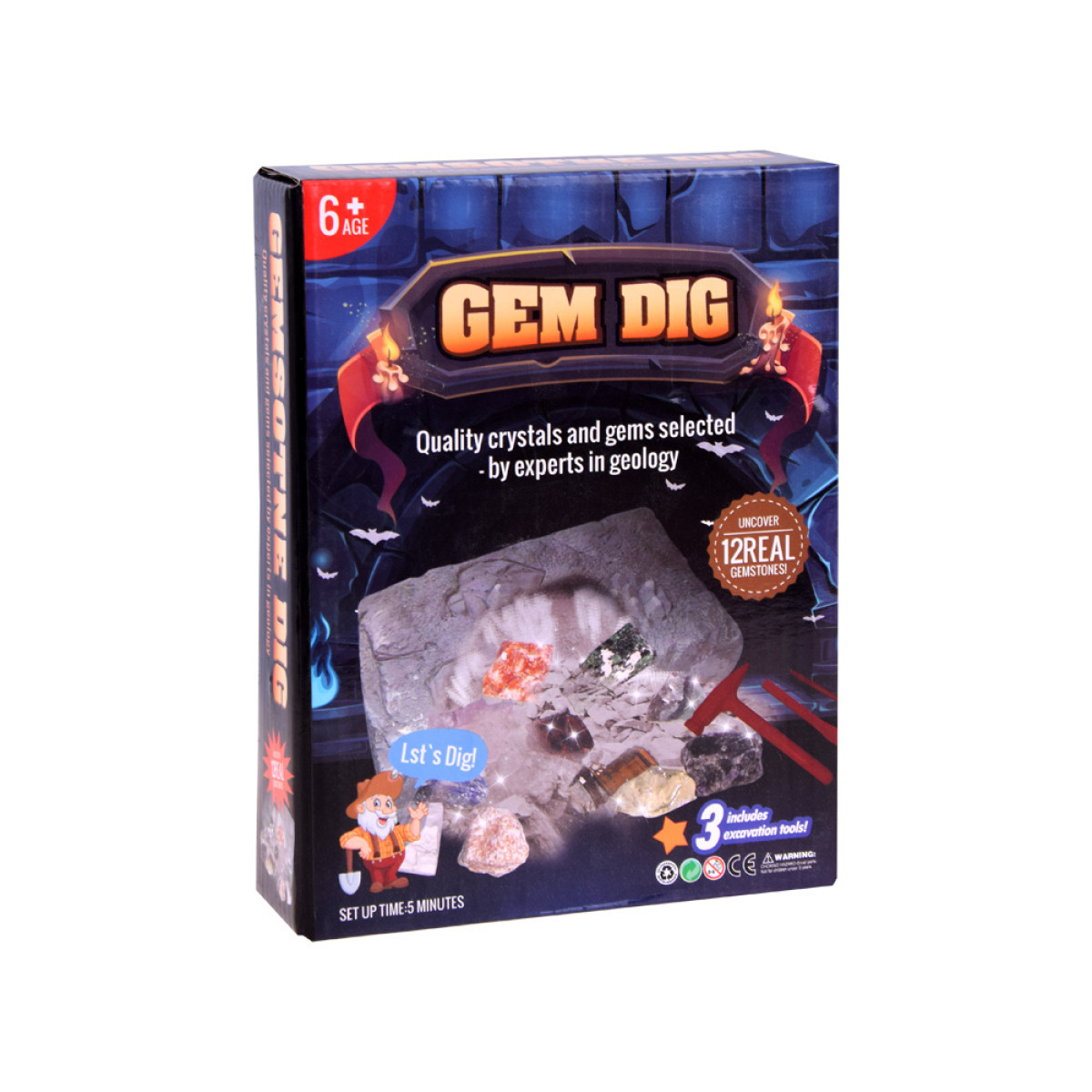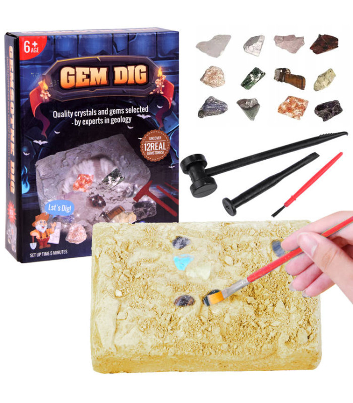 Akmenų kasykla – tai puikus edukacinis rinkinys, skirtas mažiesiems archeologams ir lobių ieškotojams. Šis savarankiškai atliekamas žaidimas suteikia unikalią ir patrauklią archeologinių kasinėjimų patirtį. Užduotis – išgauti gipso liejinyje paslėptus brangakmenius naudojant plaktuką, kaltelį ir teptuką.