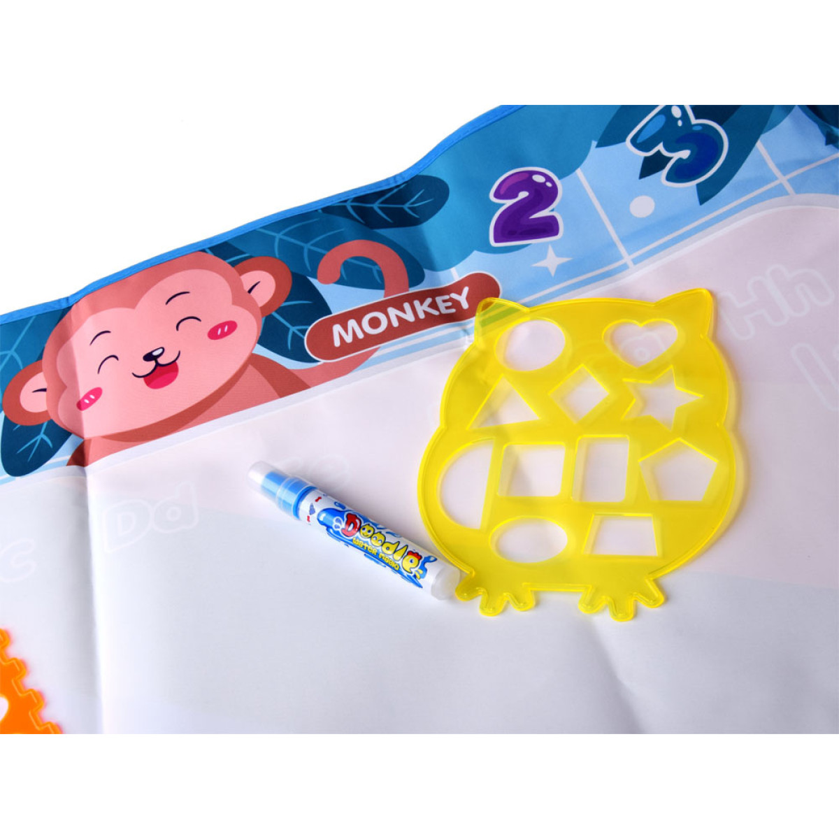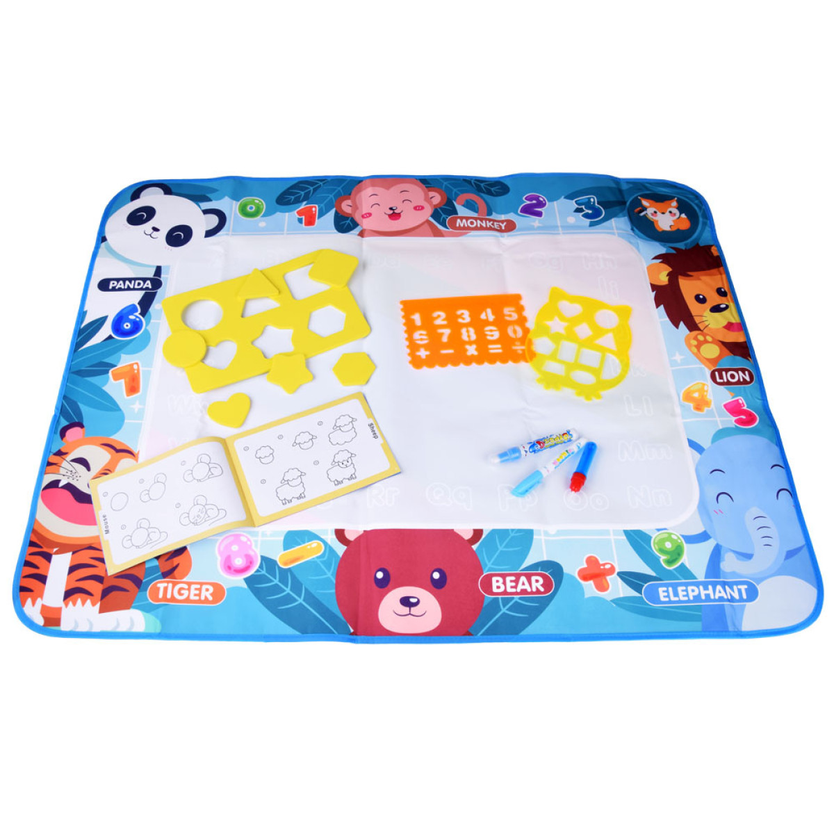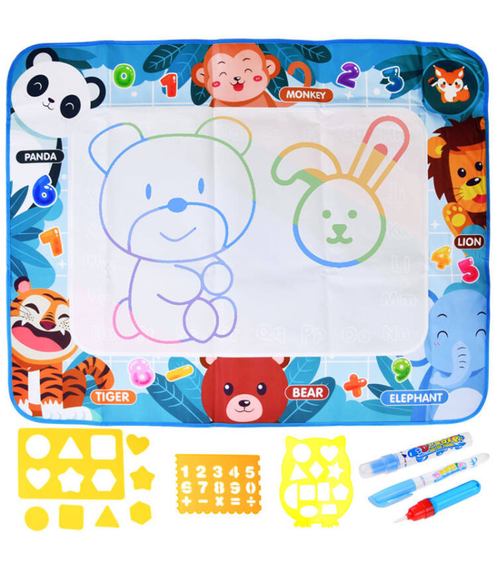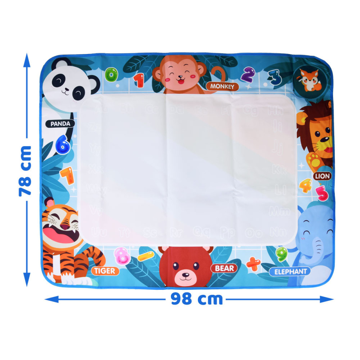 Didelis vandens piešimo kilimėlis leis kiekvienam vaikui kurti piešinius ir tapybos šedevrus be pabaigos. Su vandens pieštuku jūsų vaikas galės piešti ir tapyti iki soties! Spalvotas vandens kilimėlis dydžio 98 x 78 cm turi spalvotą foną, kuris užtikrins nuostabų spalvingą meno kūrinį. Kilimėlio kraštuose yra gyvūnų grafika su jų pavadinimais anglų kalba, todėl vaikas gali mokytis anglų kalbos žaisdamas. Žaidimas ant kilimėlio yra visiškai saugus, nes užtenka pripildyti pieštuką vandeniu ir pradėti nuotykius su piešimu, tapyba, rašymu. Komplektas papildomai turi formas atspaudimui ir teptuką. Su tokiu rinkiniu nėra šansų nuobodžiauti niūriomis dienomis.