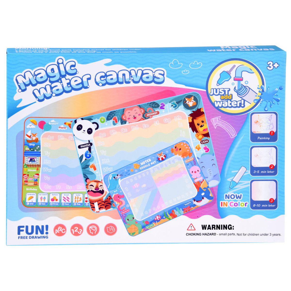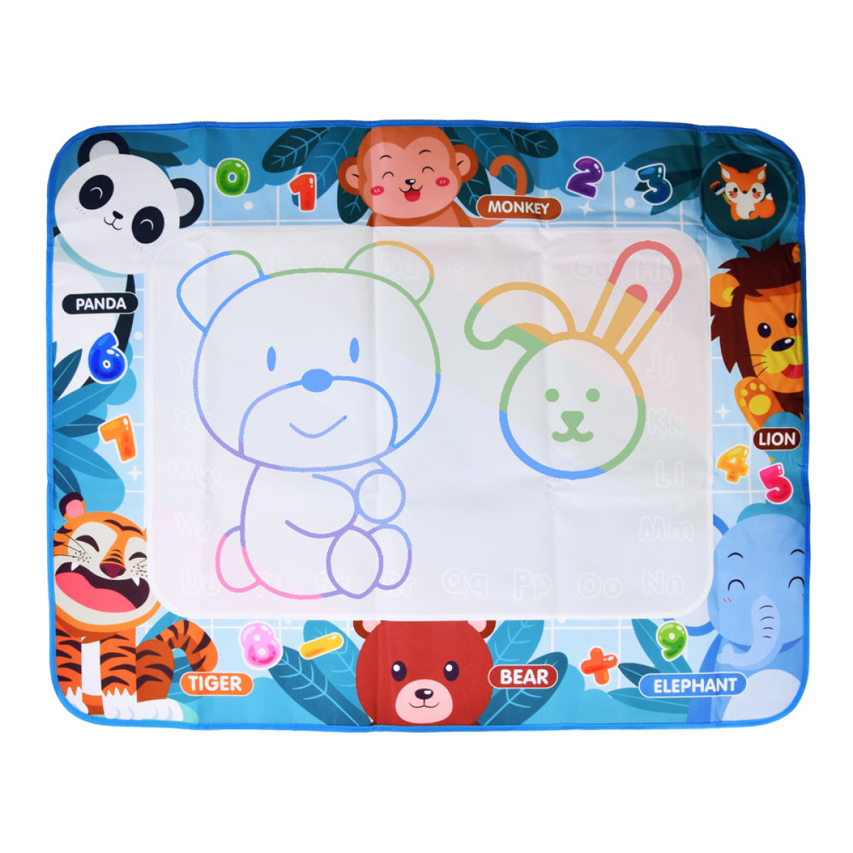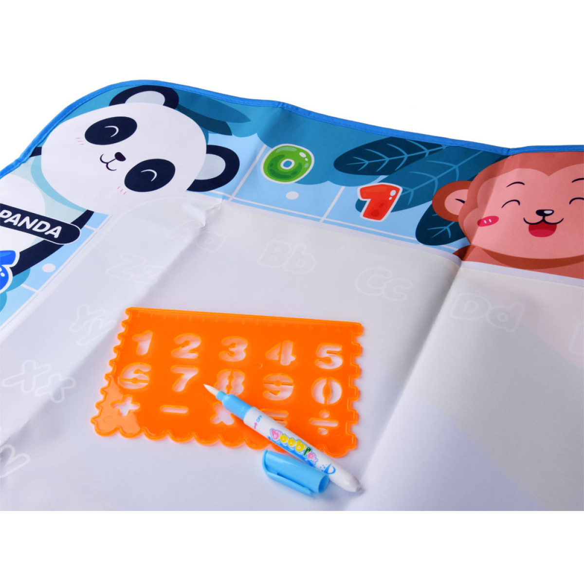 Didelis vandens piešimo kilimėlis leis kiekvienam vaikui kurti piešinius ir tapybos šedevrus be pabaigos. Su vandens pieštuku jūsų vaikas galės piešti ir tapyti iki soties! Spalvotas vandens kilimėlis dydžio 98 x 78 cm turi spalvotą foną, kuris užtikrins nuostabų spalvingą meno kūrinį. Kilimėlio kraštuose yra gyvūnų grafika su jų pavadinimais anglų kalba, todėl vaikas gali mokytis anglų kalbos žaisdamas. Žaidimas ant kilimėlio yra visiškai saugus, nes užtenka pripildyti pieštuką vandeniu ir pradėti nuotykius su piešimu, tapyba, rašymu. Komplektas papildomai turi formas atspaudimui ir teptuką. Su tokiu rinkiniu nėra šansų nuobodžiauti niūriomis dienomis.