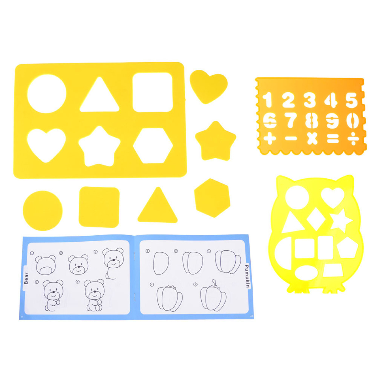 - 4 šablonai su įvairiais raštais (geometrinės figūros, skaičiai)