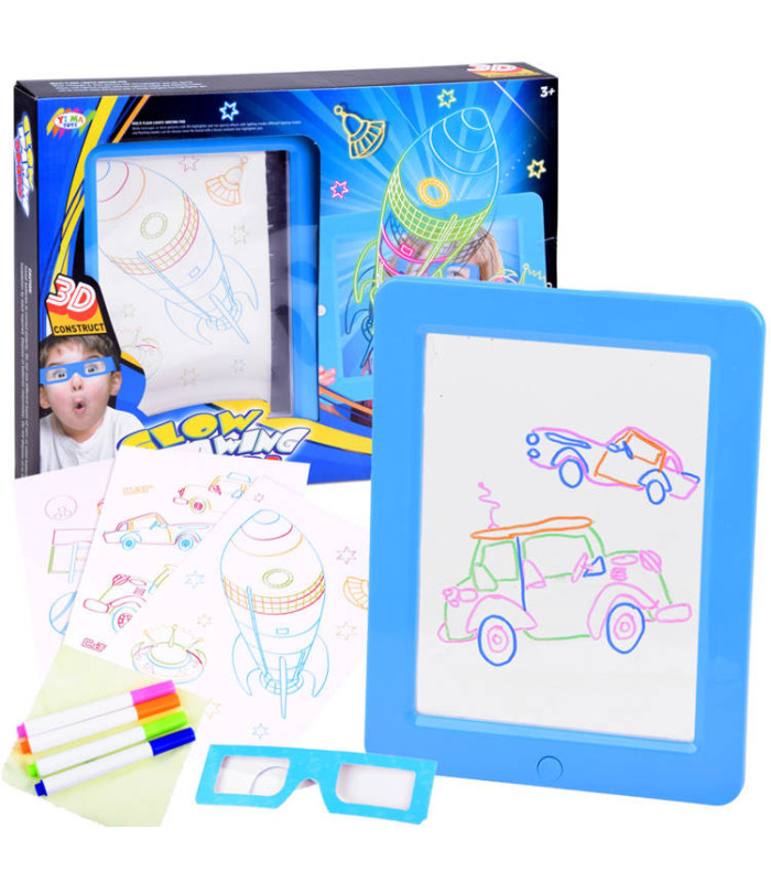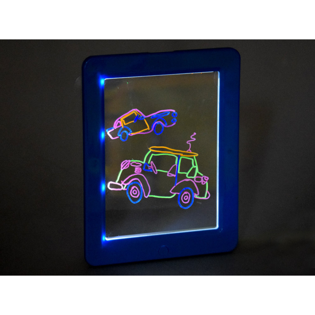 Apšviesta lentelė, skirta neoniniams piešiniams kurti, patiks kiekvienam mažam menininkui. Ši kūrybinė lentelė turi apšvietimo funkciją, kurioje galima savarankiškai piešti arba kopijuoti piešinius iš rinkinyje esančių kortelių. Vaikai, mėgstantys piešti, čia ras daug džiaugsmo, kurdami savo unikalius piešinius. Rinkinys suteiks didelį džiaugsmą kiekvienam menininkui. Naudojant vaizduotę ir rinkinyje esančius neoninius spalvotus pieštukus (žalią, mėlyną, oranžinį ir rožinį), galima kurti nepaprastus piešinius. Rinkinyje yra pagalbiniai piešiniai, kurie padės lengviau sukurti savo meno kūrinius. Baigtus šedevrus reikėtų įdėti į LED apšviestą lentelę. Vaikas su rinkinyje esančiais 3D akiniais galės žiūrėti savo piešinius trimatėje erdvėje, kas suteiks dar daugiau džiaugsmo. Komplekte taip pat yra servetėlė, su kuria galima kurti neribotą kiekį piešinių. Sukurtas piešinys puikiai tiks kaip kambario dekoracija ar naktinė lemputė.