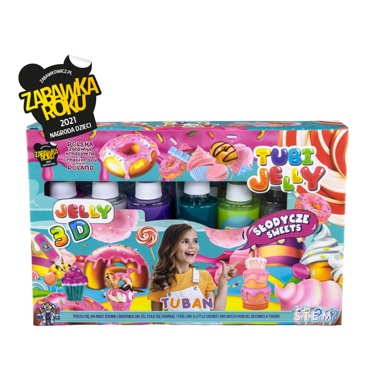 Naudodamiesi ilginiais buteliukais, pripildytais gelinio skysčio, užpildykite šablone nupieštą raštą, o tada panardinkite jį į specialų aktyvatoriaus mišinį. Palaukite keletą minučių... ir jūsų trijų dimensijų želė yra paruošta! Tubi Jelly yra nuostabiai spalvoti, elastingi ir malonūs liesti. Žaidimas su jais yra kūrybingas ir įkvepiantis.