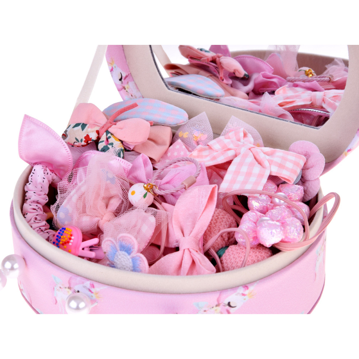 - Dėžutė švelniai rožinės spalvos, papuošta vienaragių grafika, atrodo žavingai ir mergaitiškai