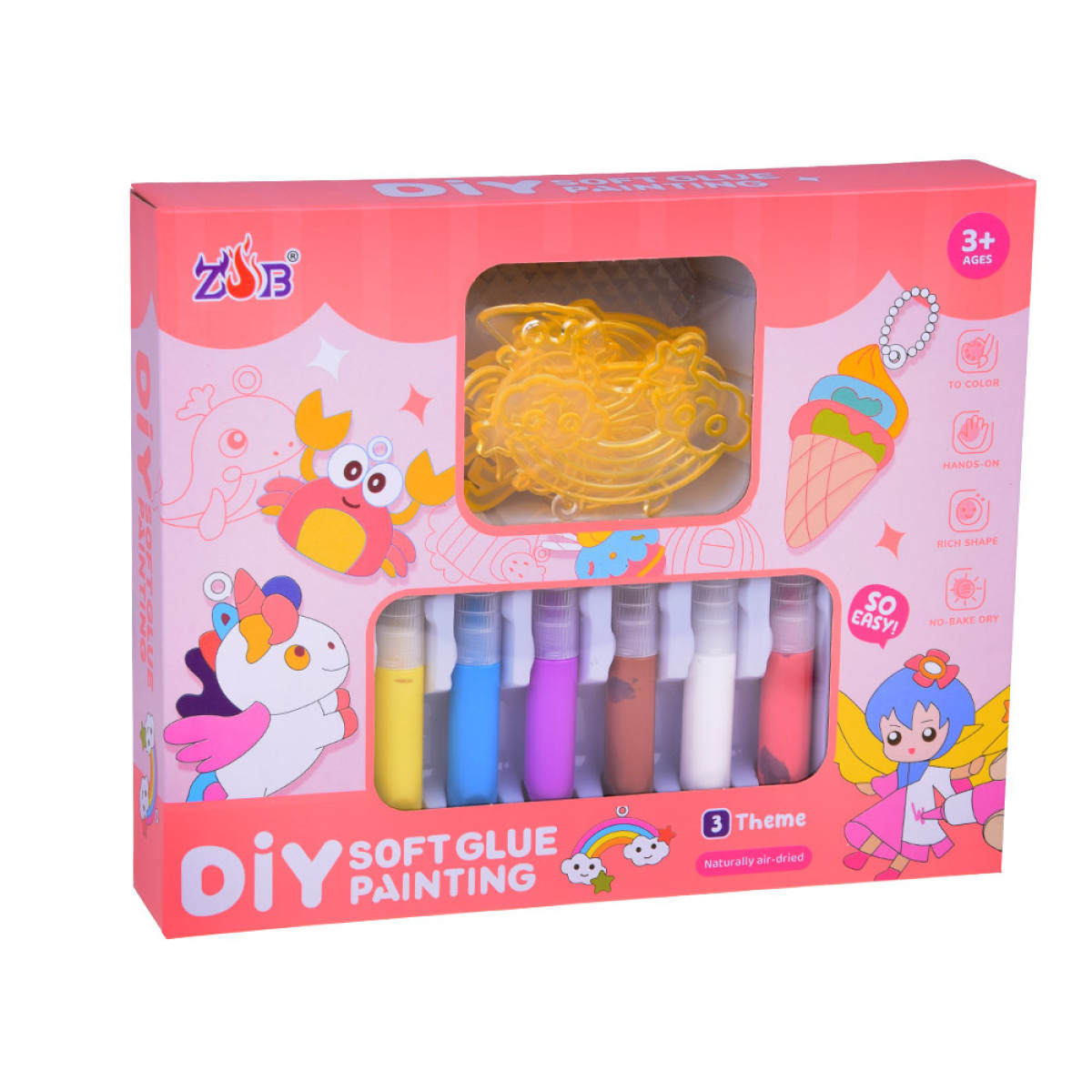 Naudodami specialius dažus (6 gražios spalvos), kurie puikiai tinka į šablonų formeles, tapyba tampa labai paprasta ir maloni. Dažai neišsilieja už kraštų, todėl vaikas gali sukurti tikslius, gražiai atrodančius kūrinius, kurie džiugins ne tik mažuosius.